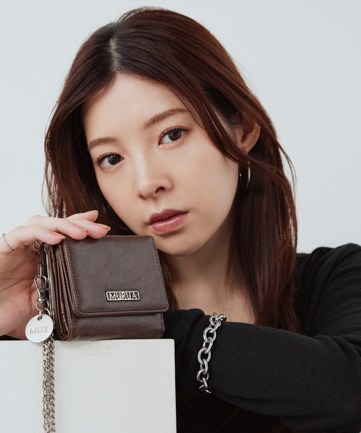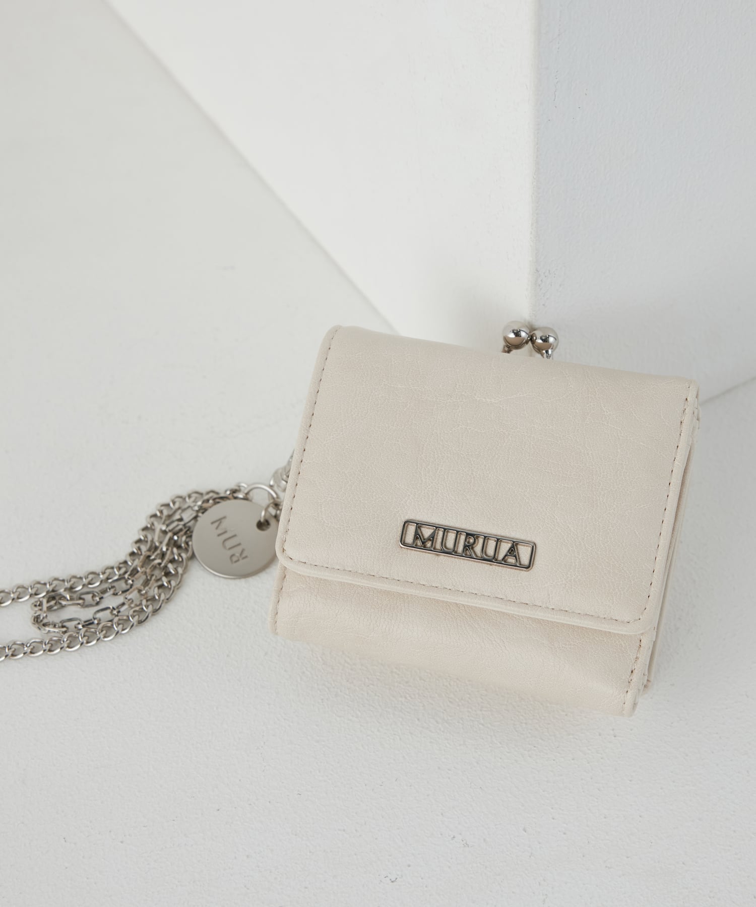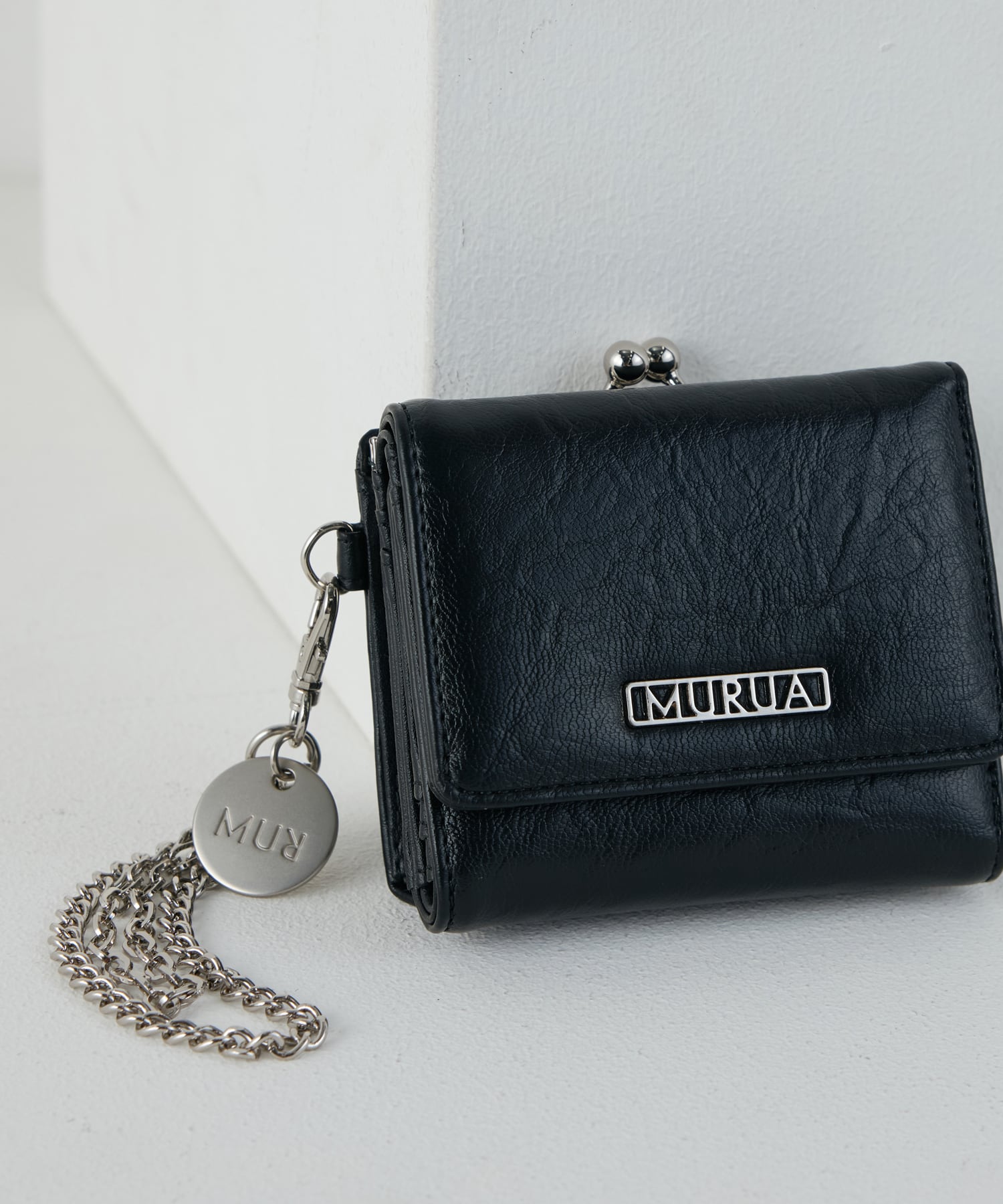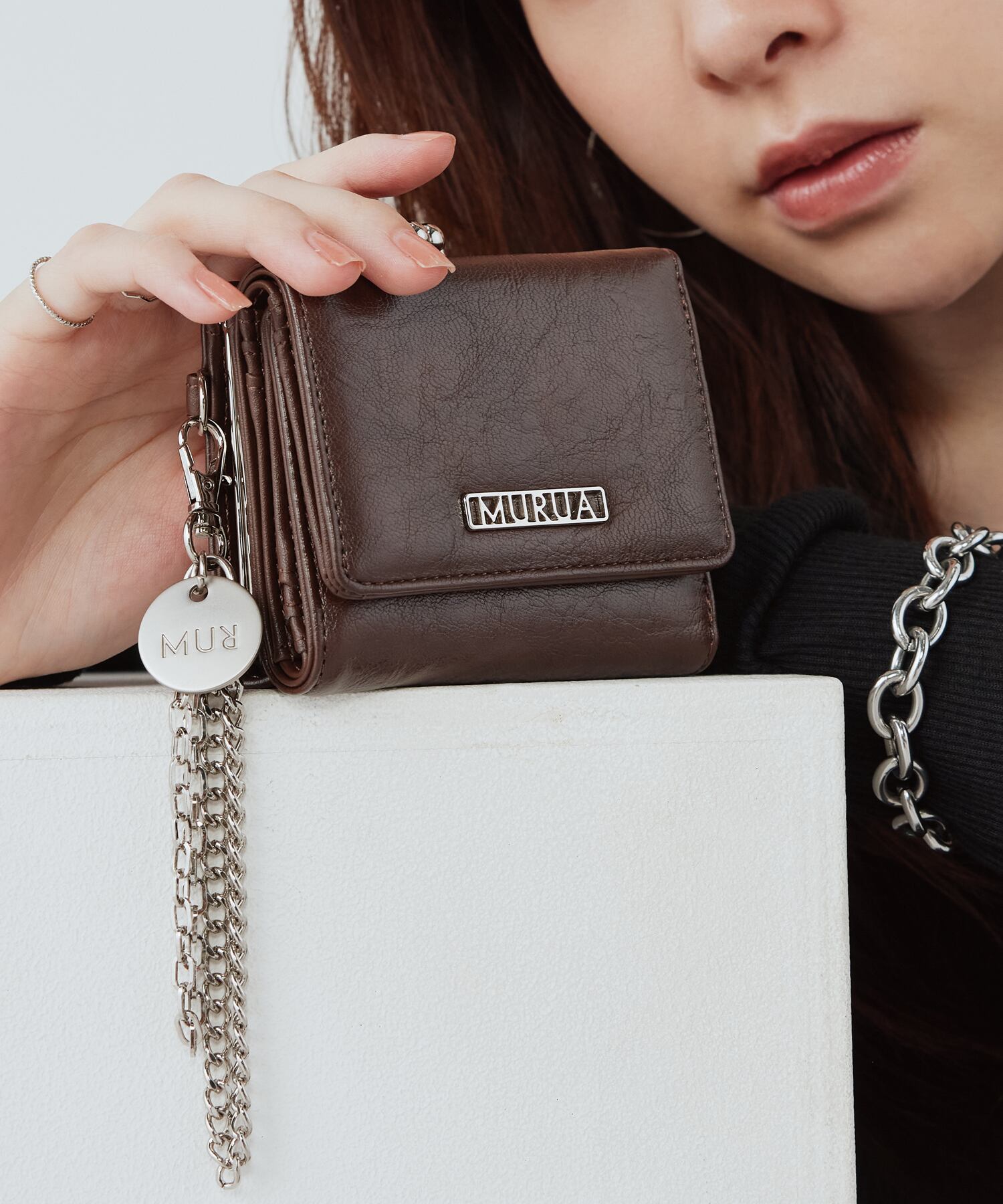シワ感のあるフェイクレザーを使用し、ユーズド感漂うデザイン。チェーンチャームを付ける事で強さをプラスし、MURUAらしさを高めました。財布上部に出る口金の金具がデザインにアクセントを加えます。