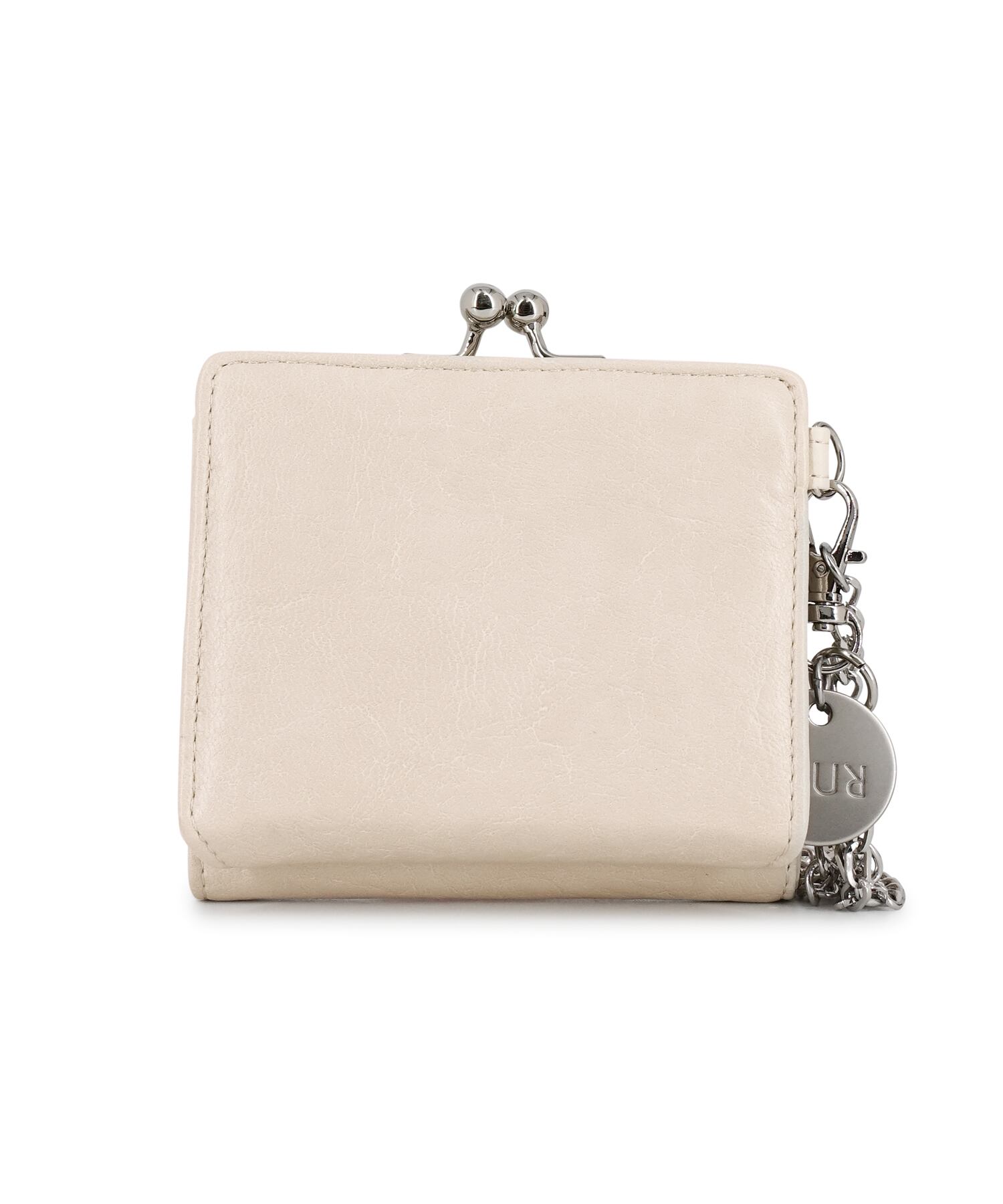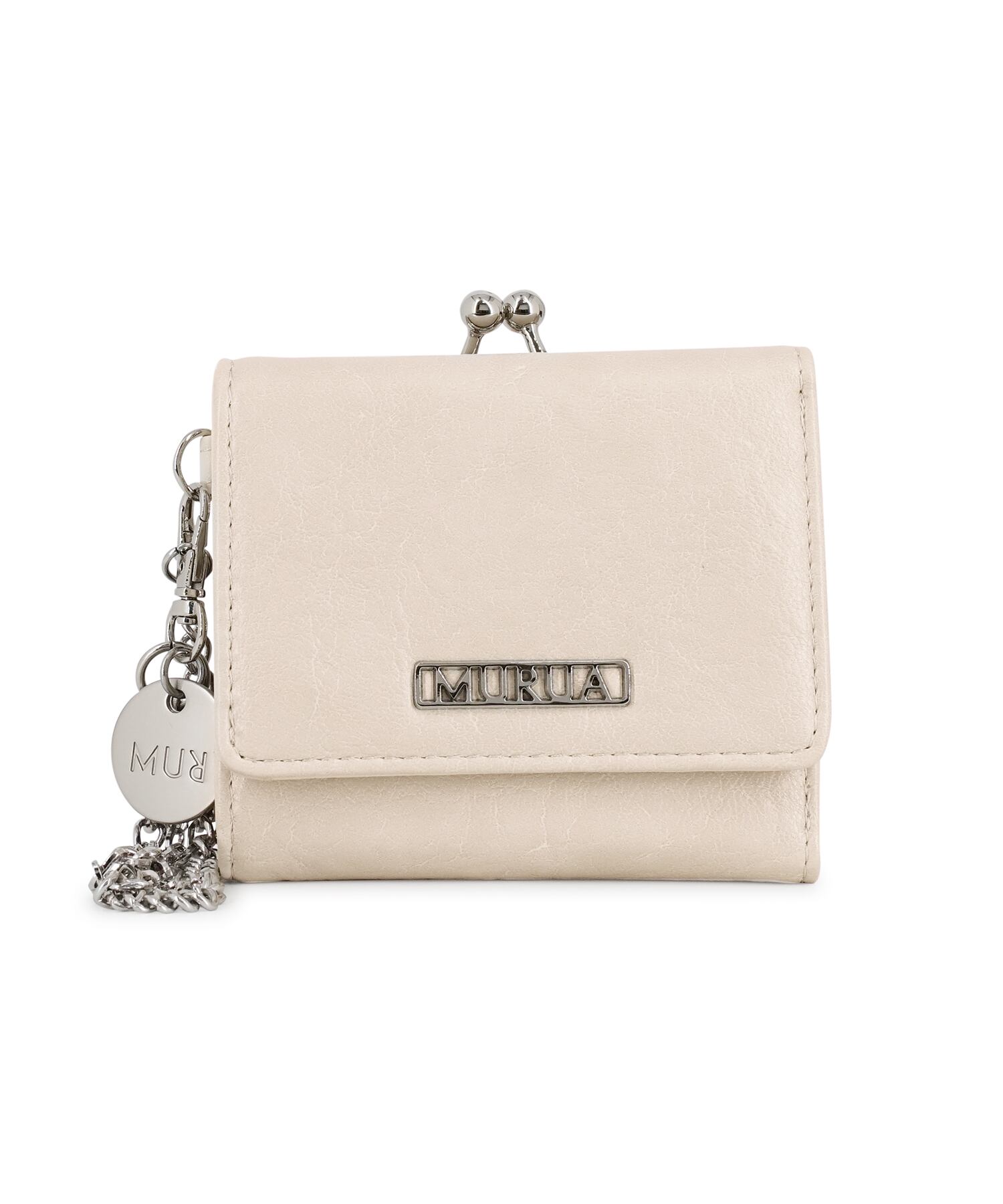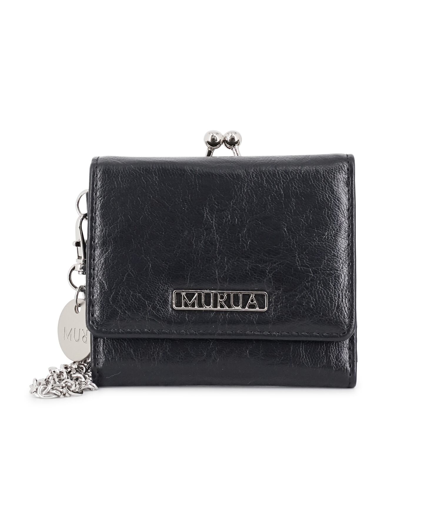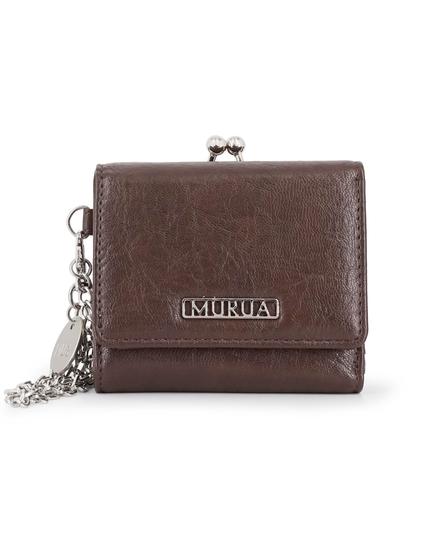シワ感のあるフェイクレザーを使用し、ユーズド感漂うデザイン。チェーンチャームを付ける事で強さをプラスし、MURUAらしさを高めました。財布上部に出る口金の金具がデザインにアクセントを加えます。