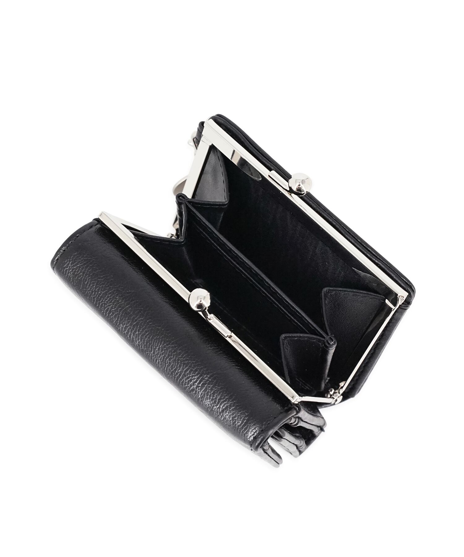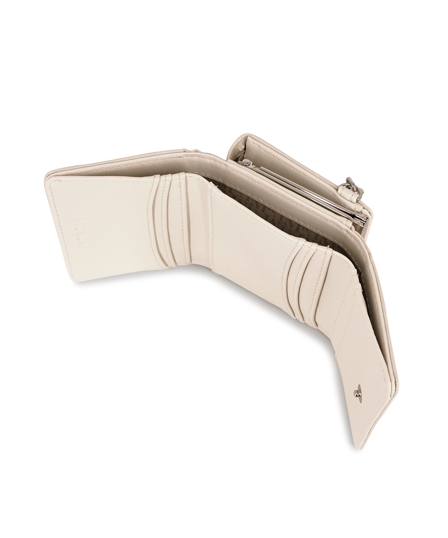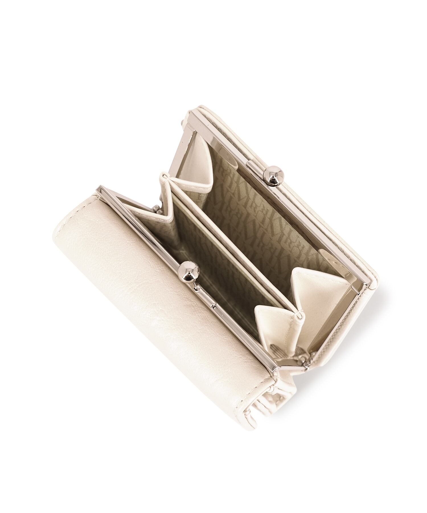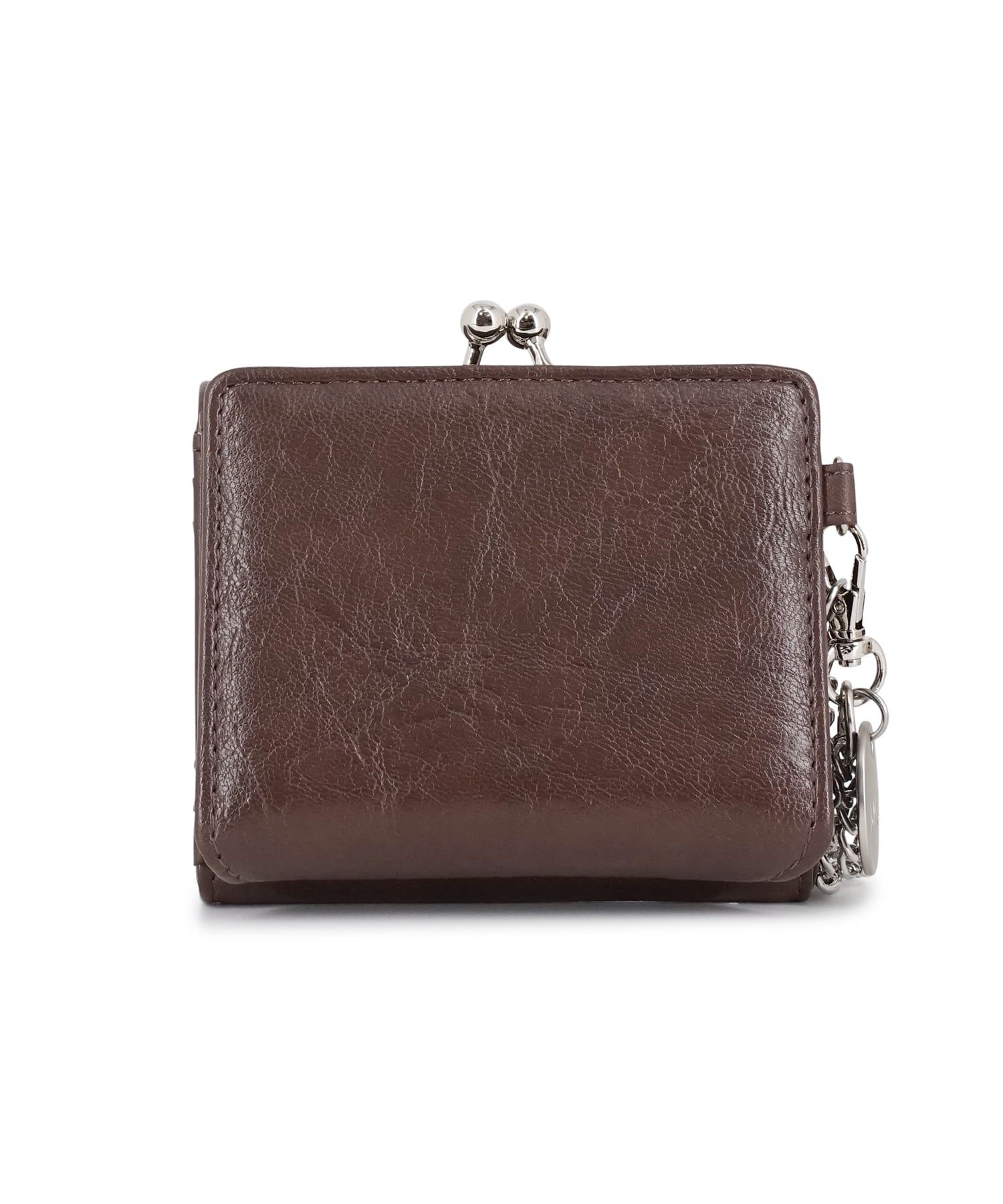 シワ感のあるフェイクレザーを使用し、ユーズド感漂うデザイン。チェーンチャームを付ける事で強さをプラスし、MURUAらしさを高めました。財布上部に出る口金の金具がデザインにアクセントを加えます。