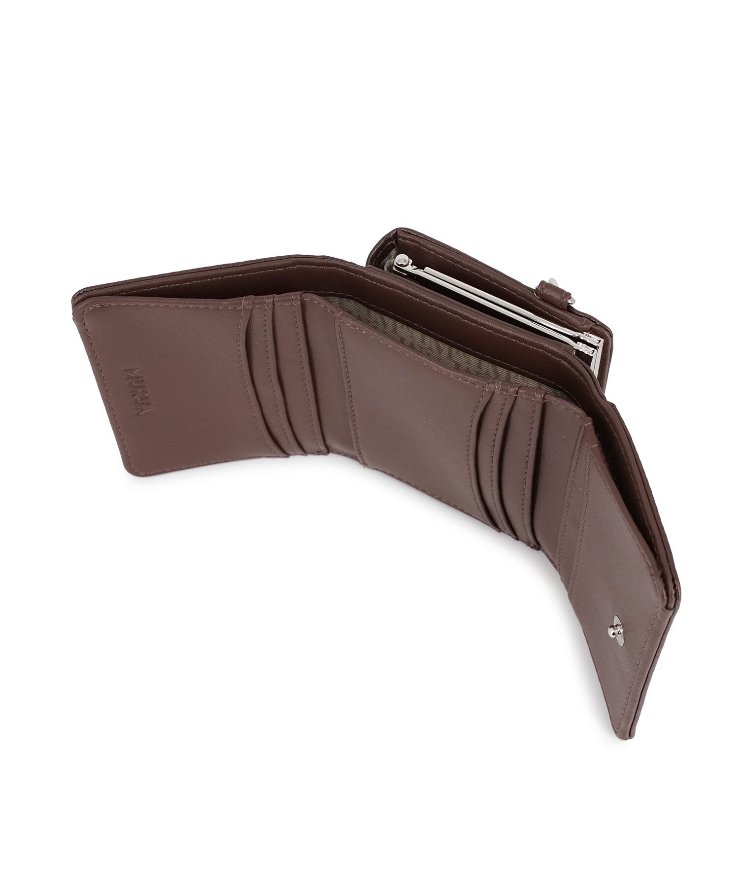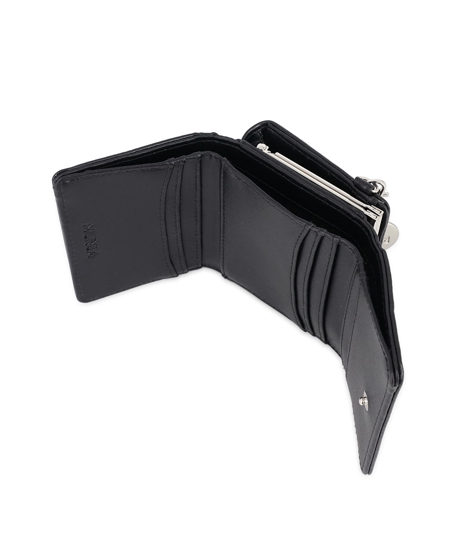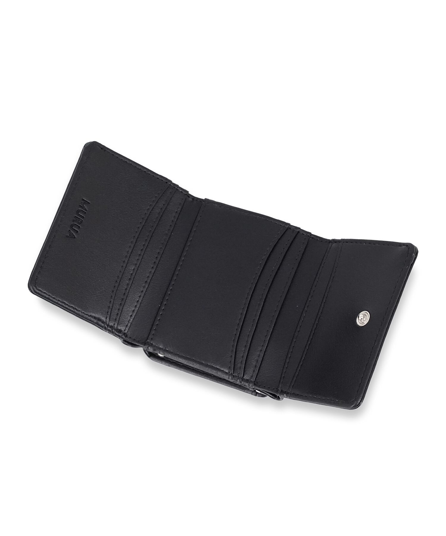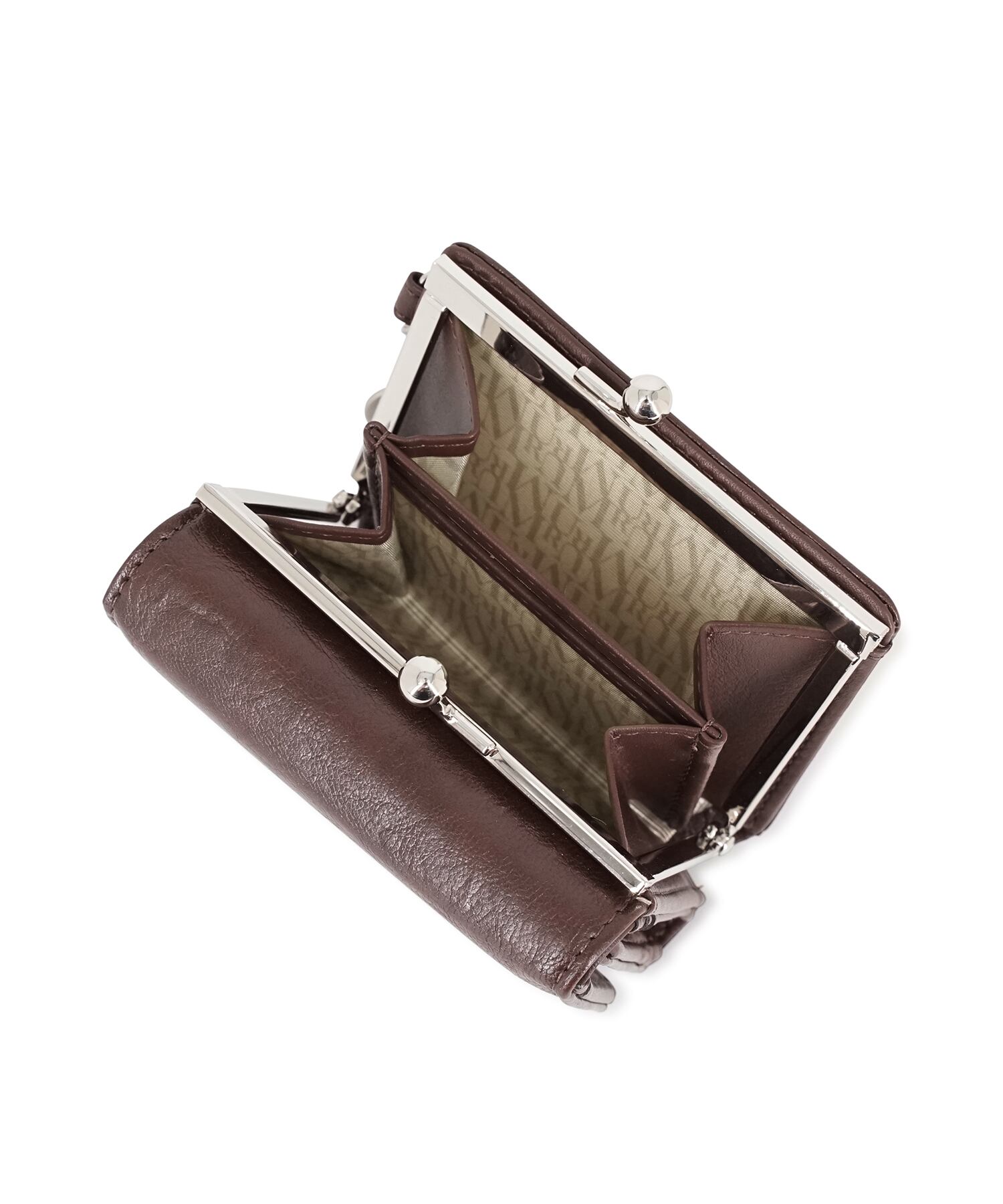 シワ感のあるフェイクレザーを使用し、ユーズド感漂うデザイン。チェーンチャームを付ける事で強さをプラスし、MURUAらしさを高めました。財布上部に出る口金の金具がデザインにアクセントを加えます。