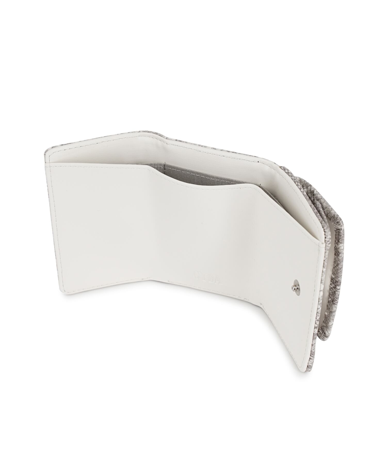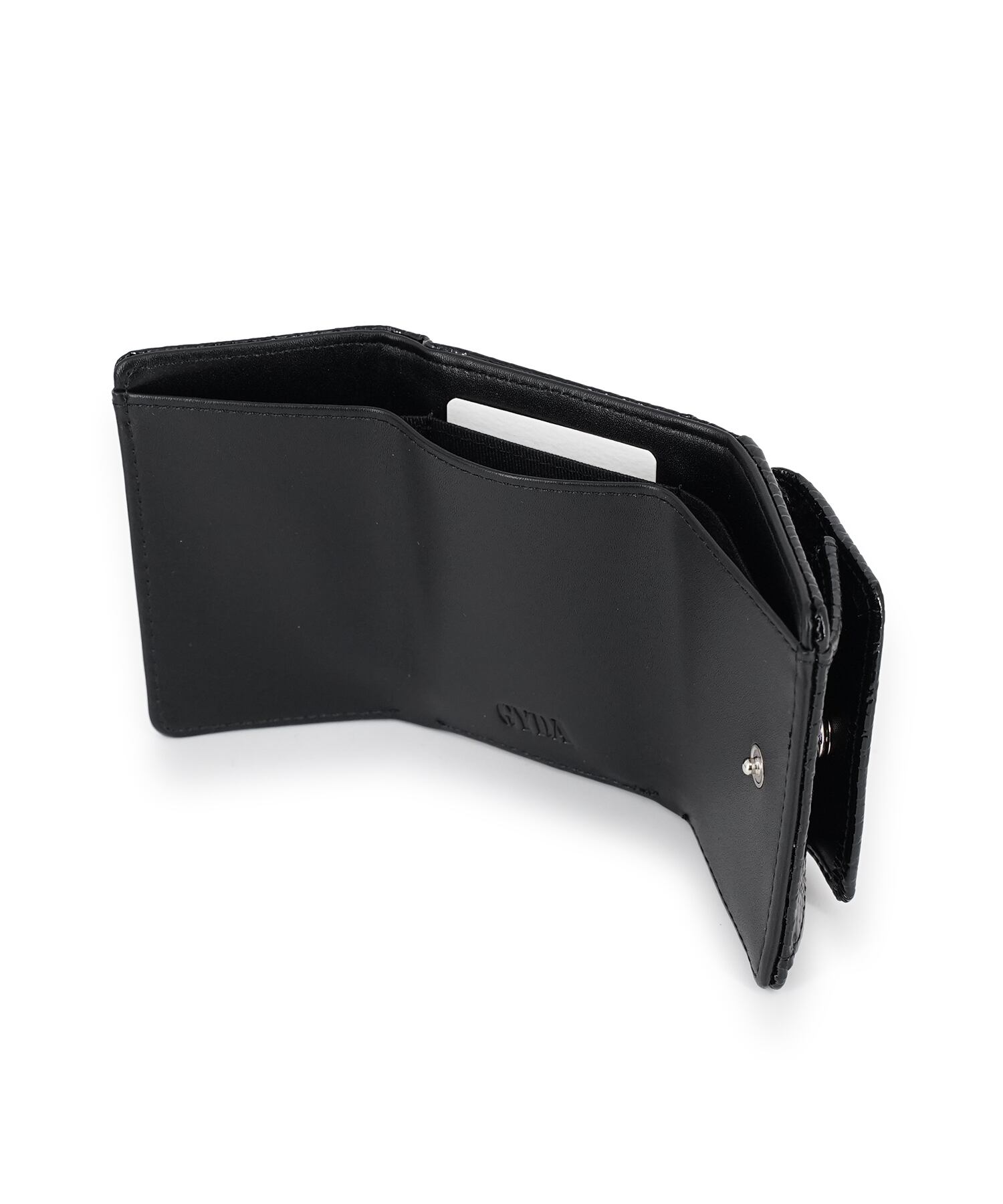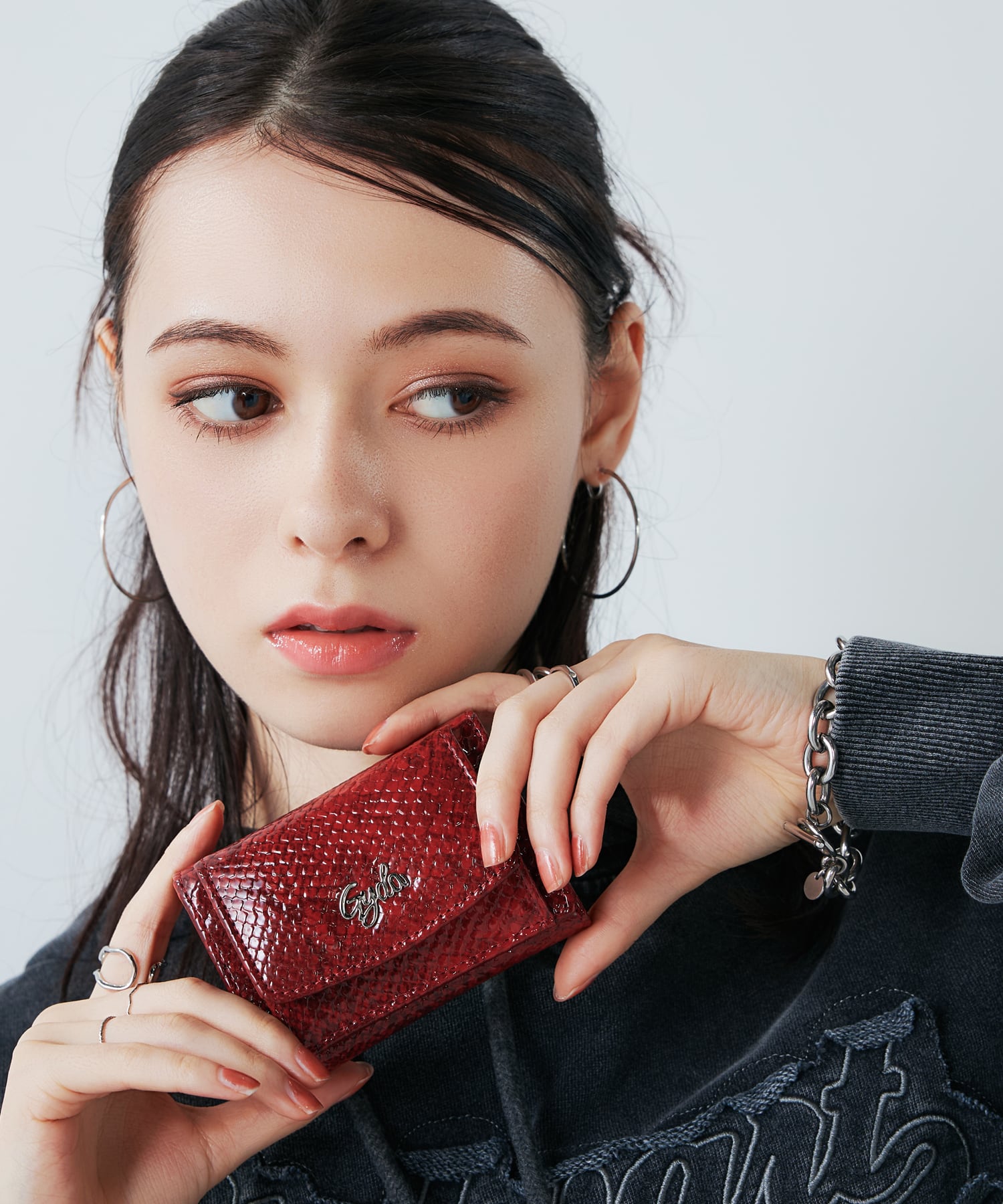 パイソン柄のエンボスを全面に施したロックテイストなデザイン。強い女性を表現したデザインには蛇にも見えるオリジナルのロゴメタルを添えました。ポケットにも入る程の小さなサイズ感でキャッシュレス決済が多い方にとって使い勝手の良いアイテムに仕上げました。