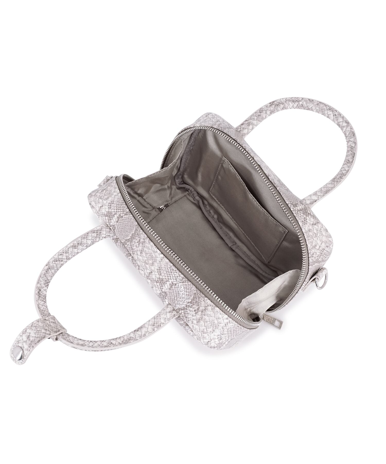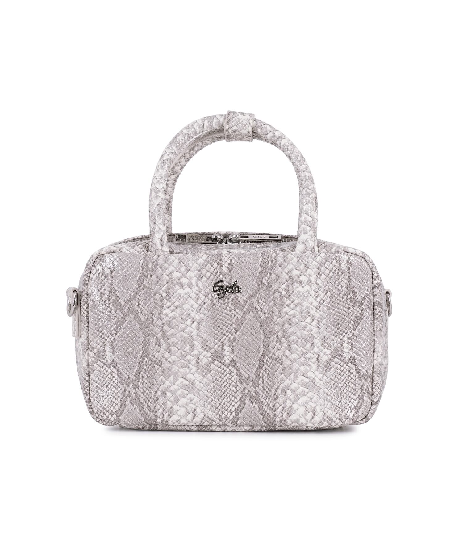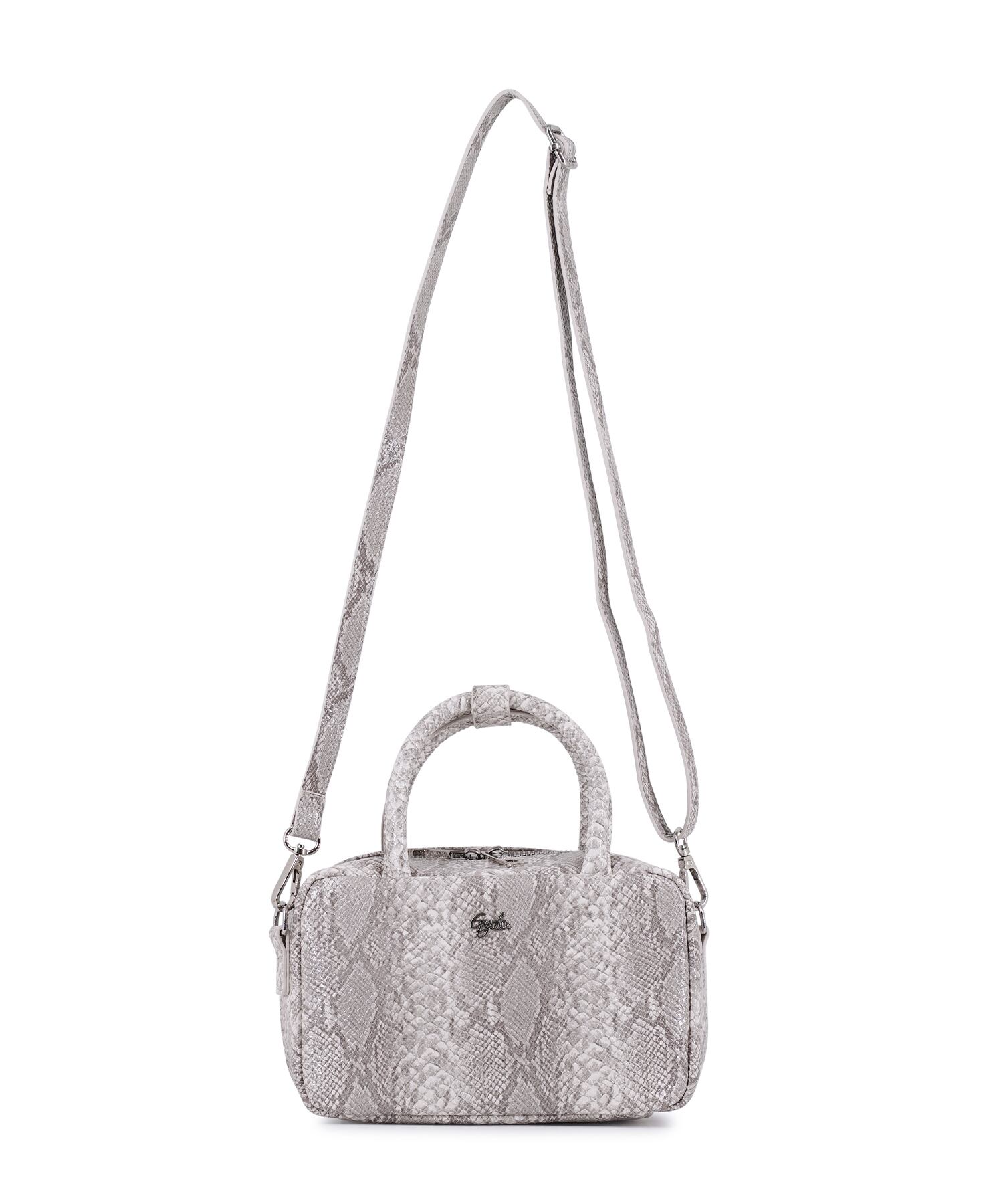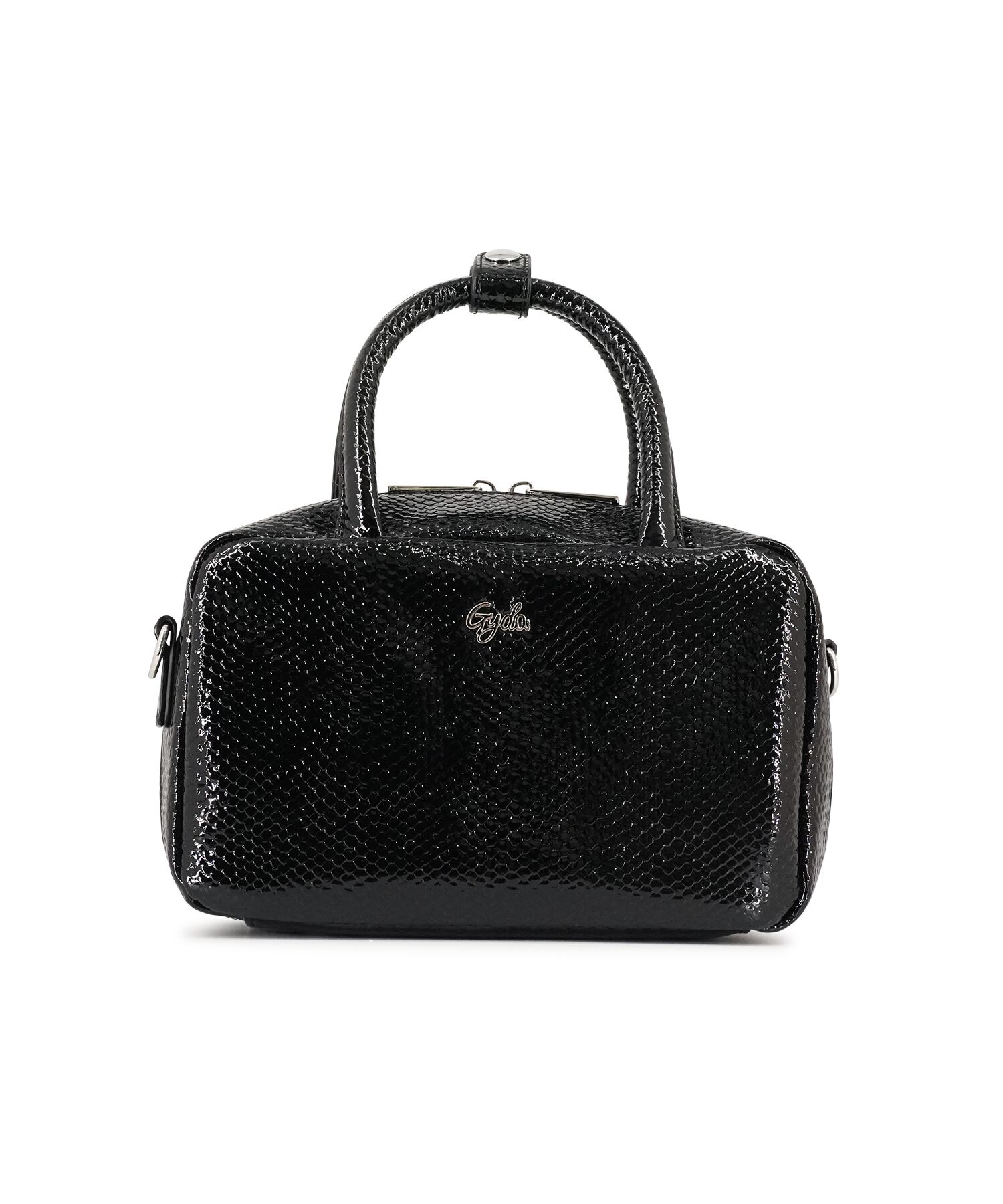 パイソン柄のエンボスを全面に施したロックテイストなデザイン。強い女性を表現したデザインには蛇にも見えるオリジナルのロゴメタルを添えました。スクエアディテールのミニボストンバッグは付属のショルダーを付ける事でショルダーバッグとしても。