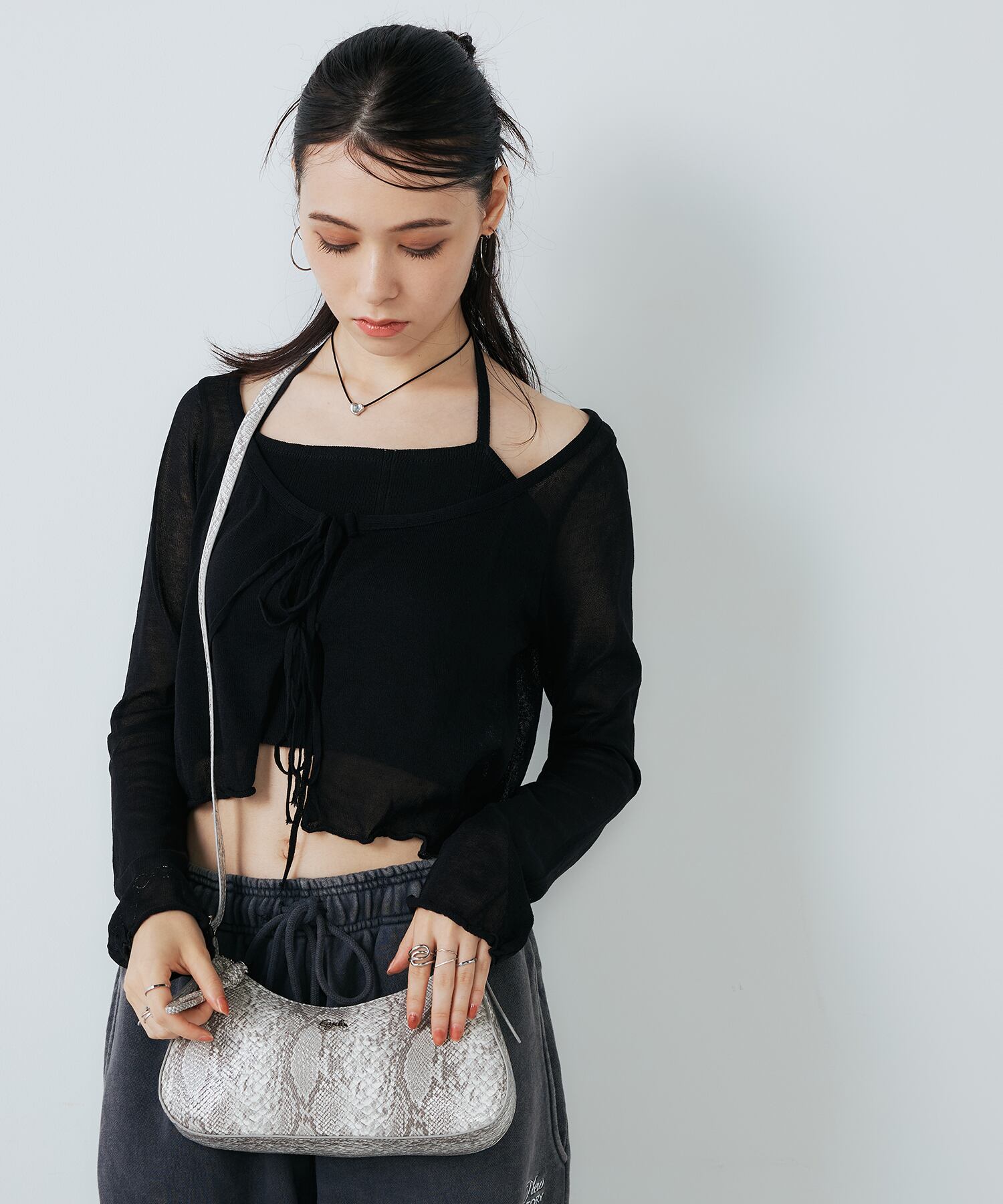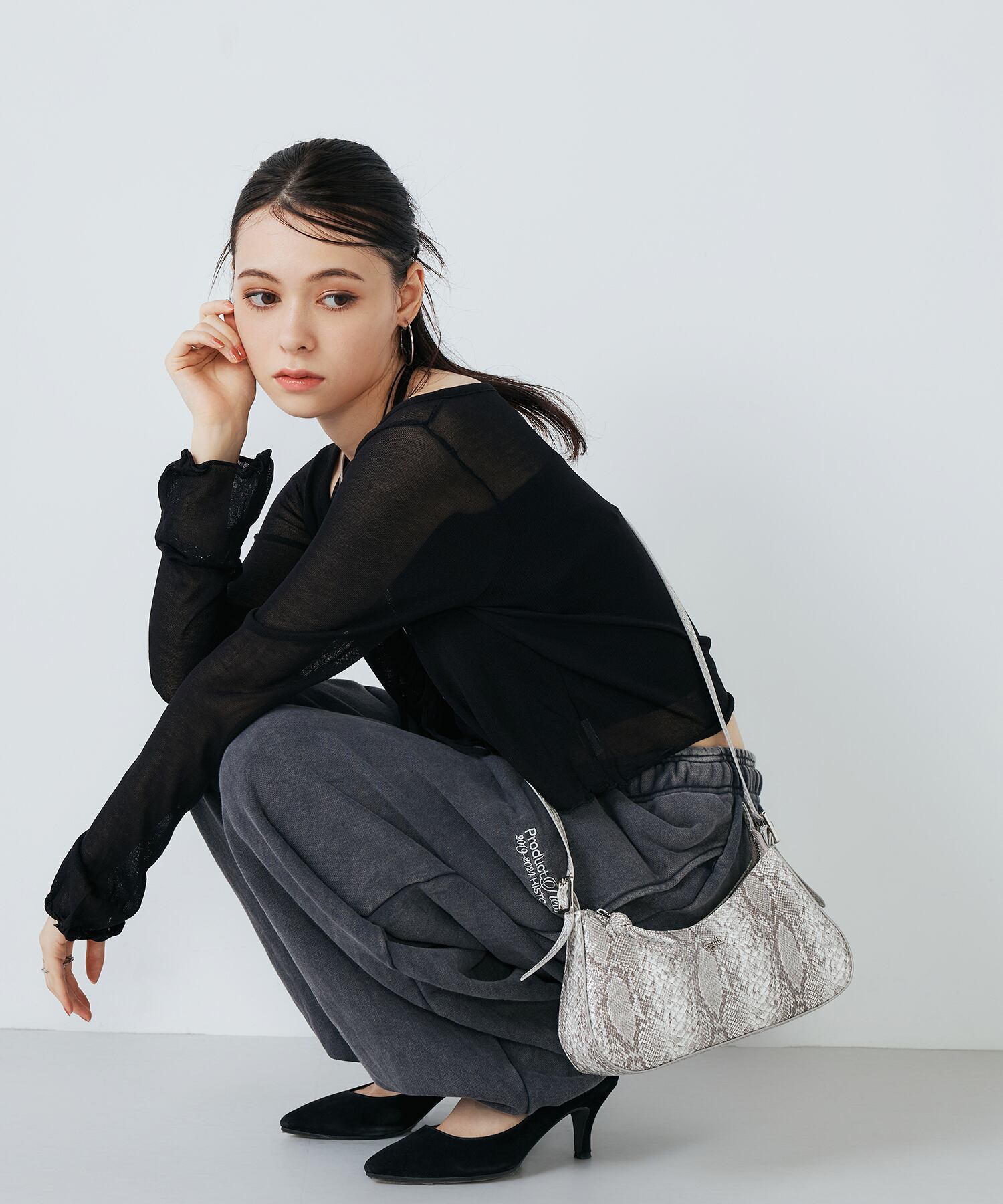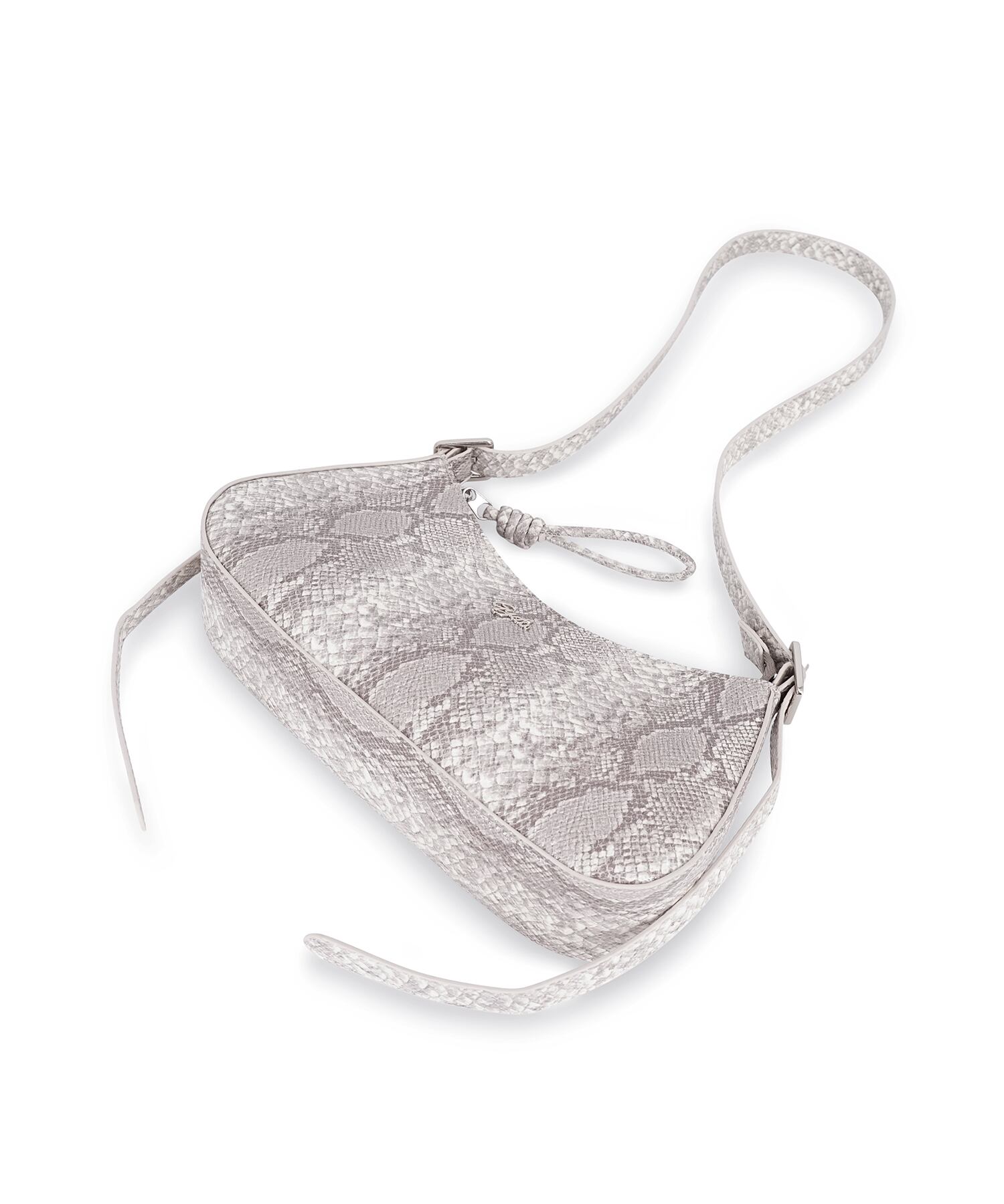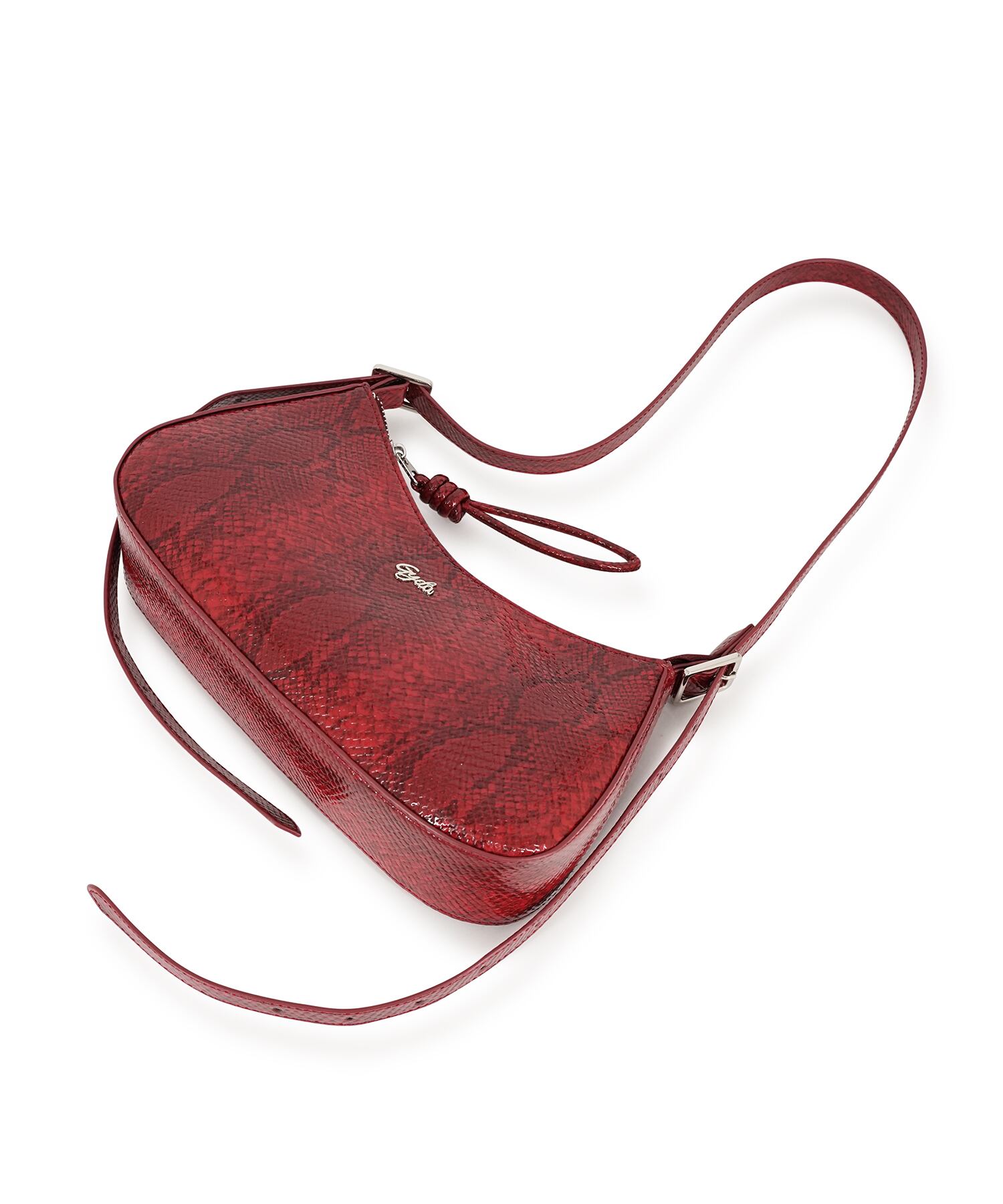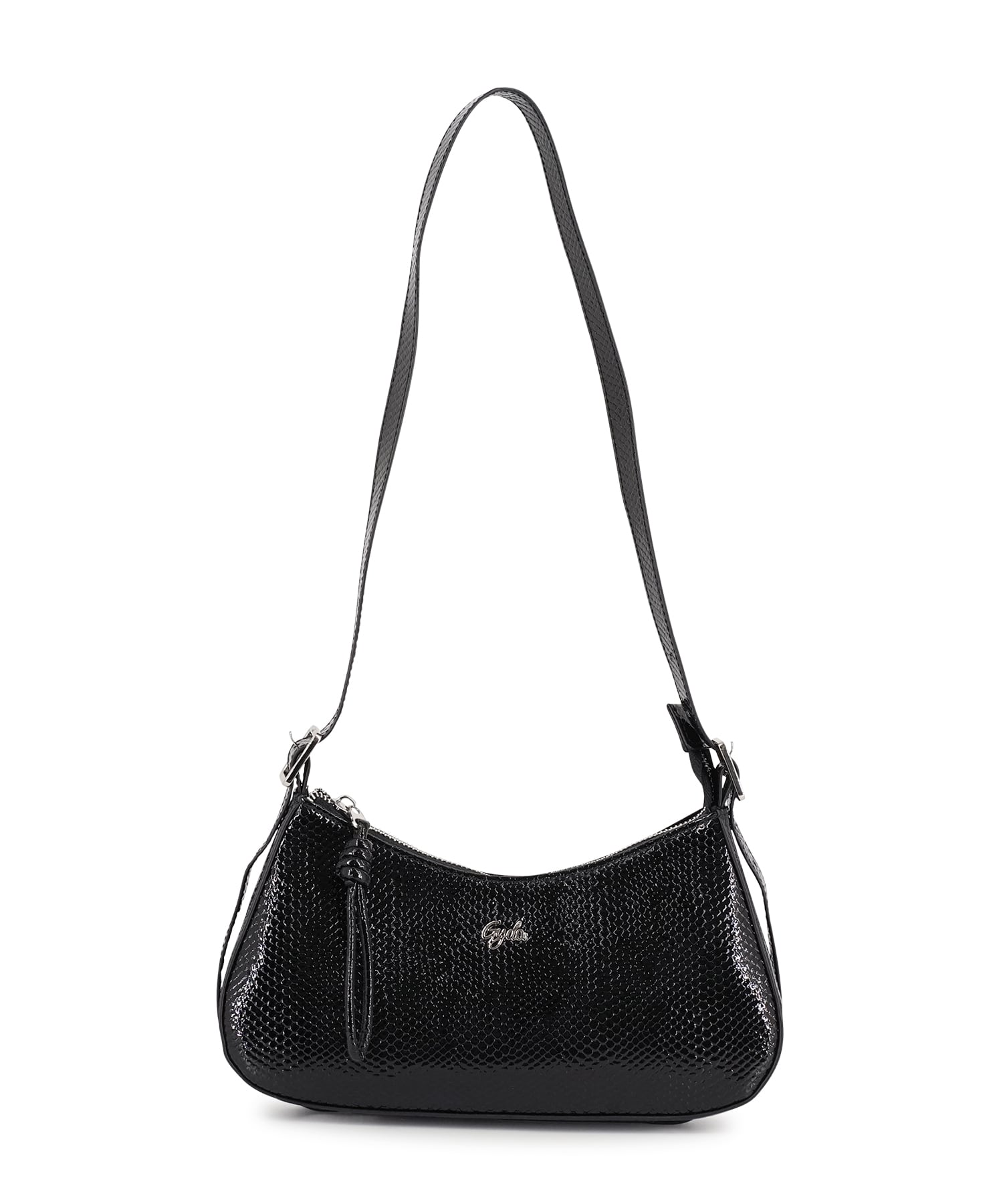パイソン柄のエンボスを全面に施したロックテイストなデザイン。強い女性を表現したデザインには蛇にも見えるオリジナルのロゴメタルを添えました。様々なコーディネートとの相性を考え身体のラインに沿うコンパクトなサイズ感に仕上げました。