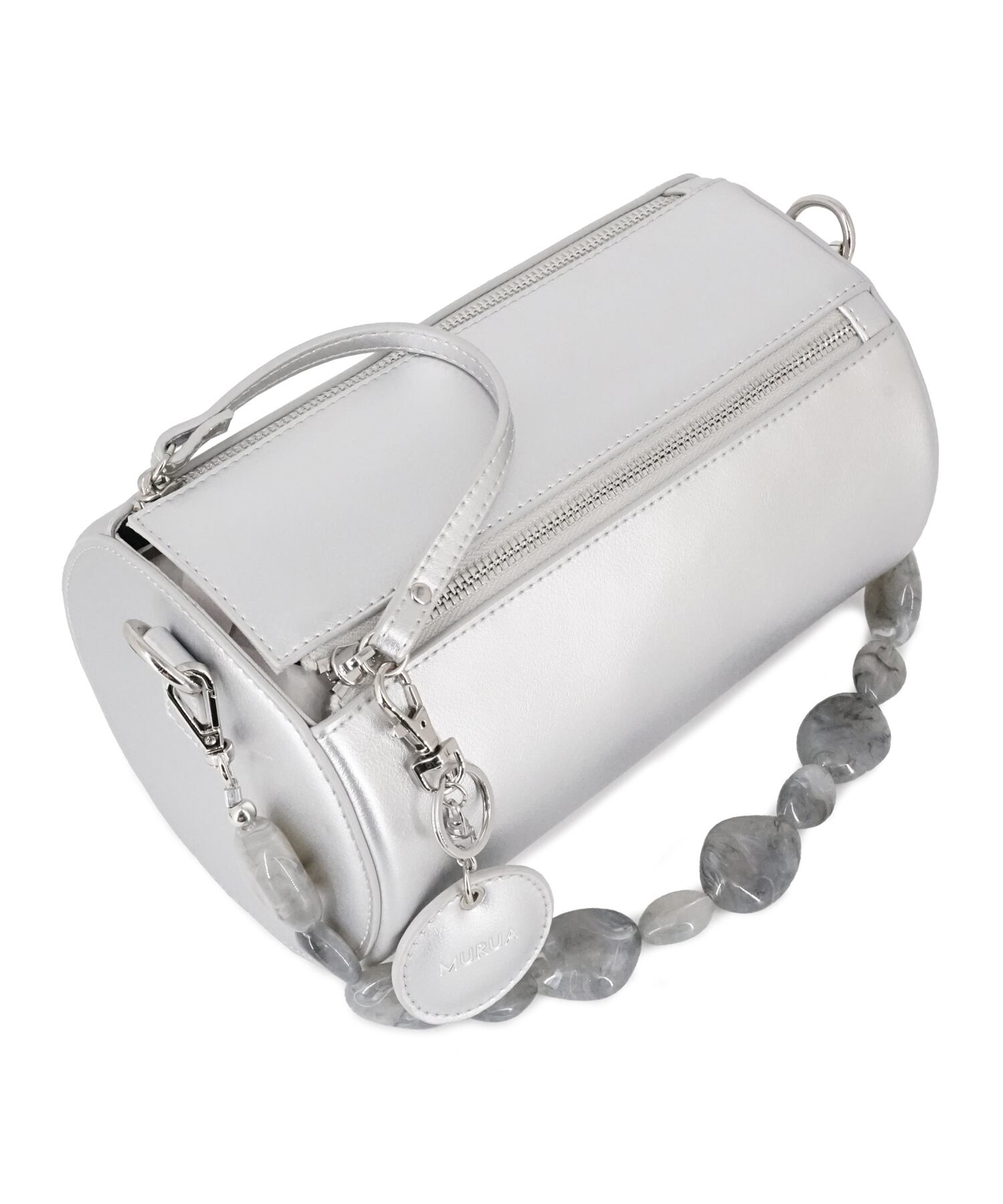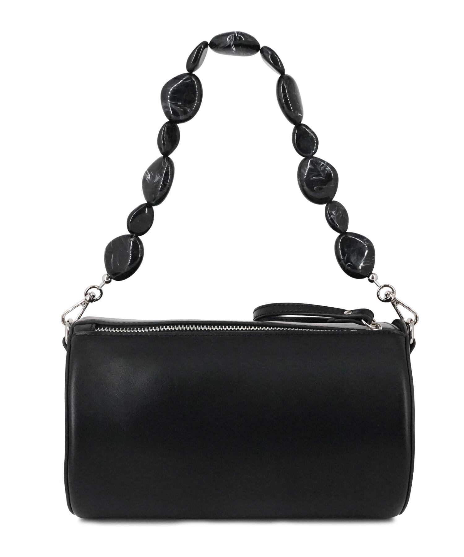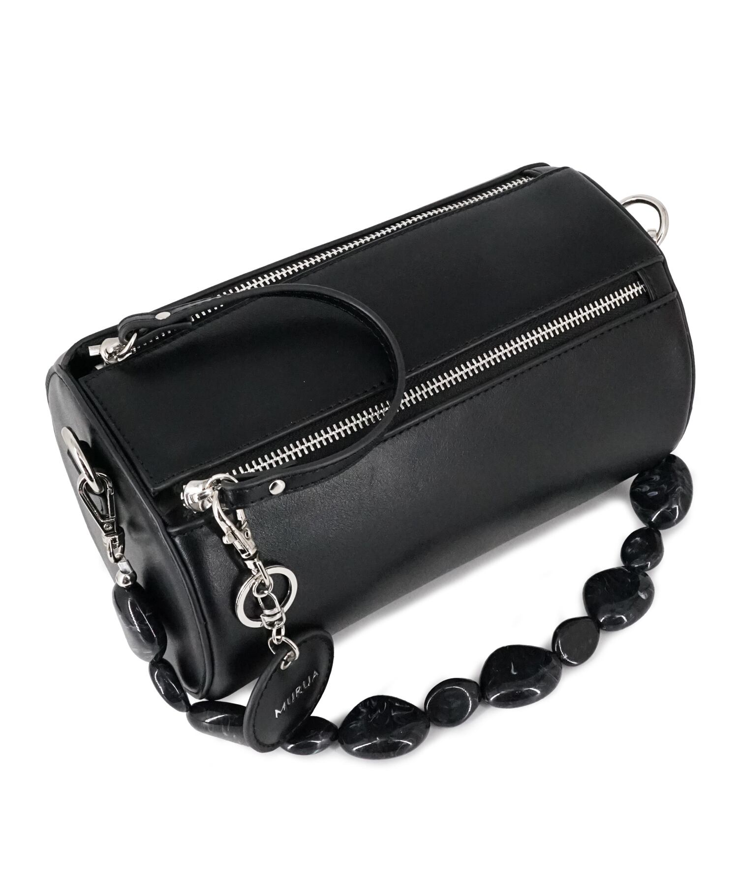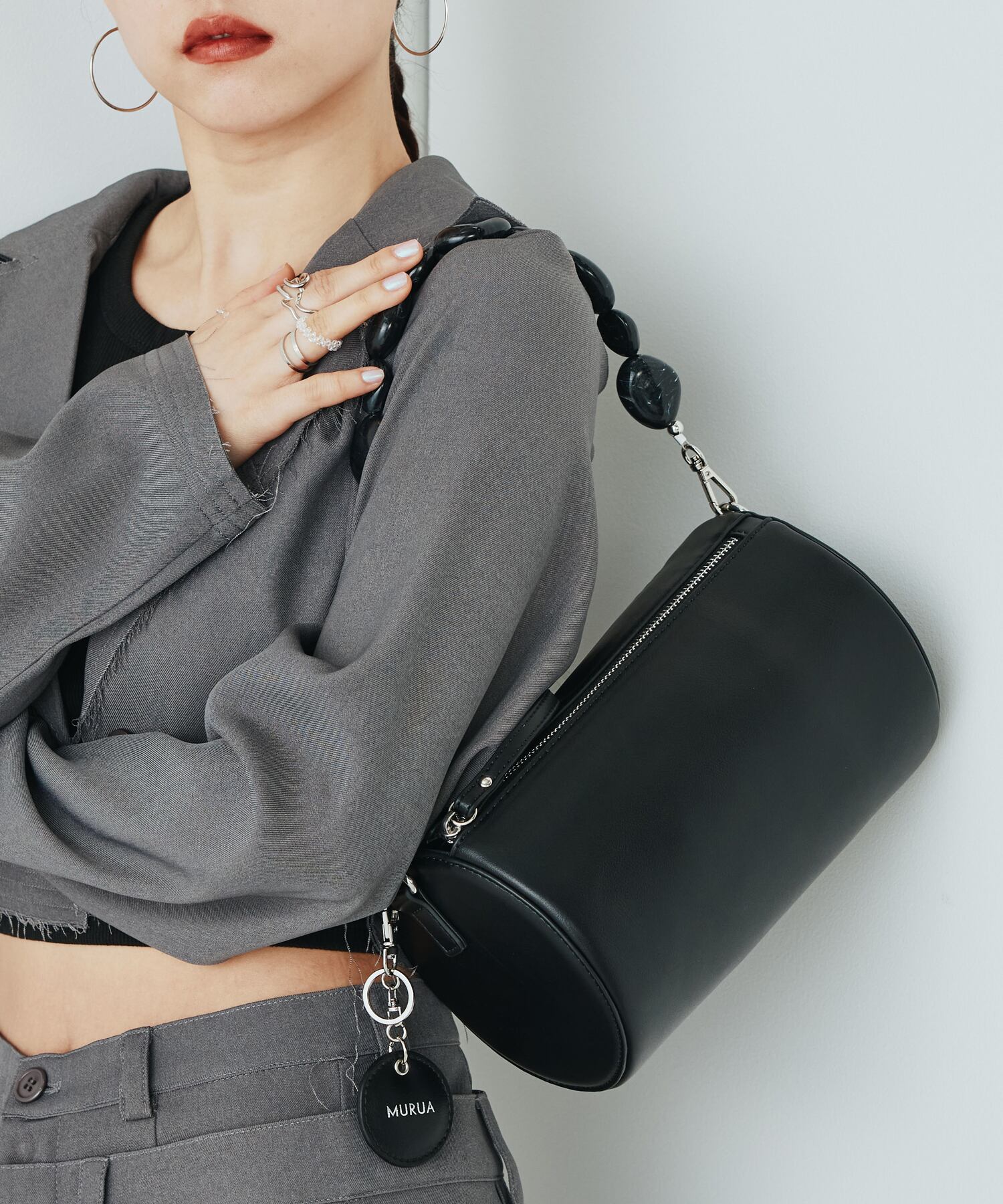 ストーン風のショルダーとフェイクレザーのショルダーが付属したシリンダーバッグ。丸型の弱みでもある荷物の取り出しにくさをダブルがファスナーを採用する事で解消させました。デイリーユースからオケージョンまで幅広いシーンでお使いいただけます。