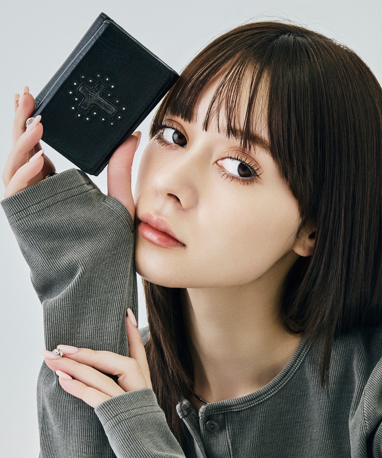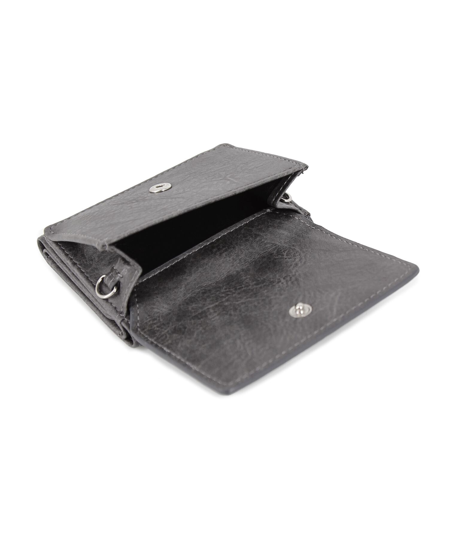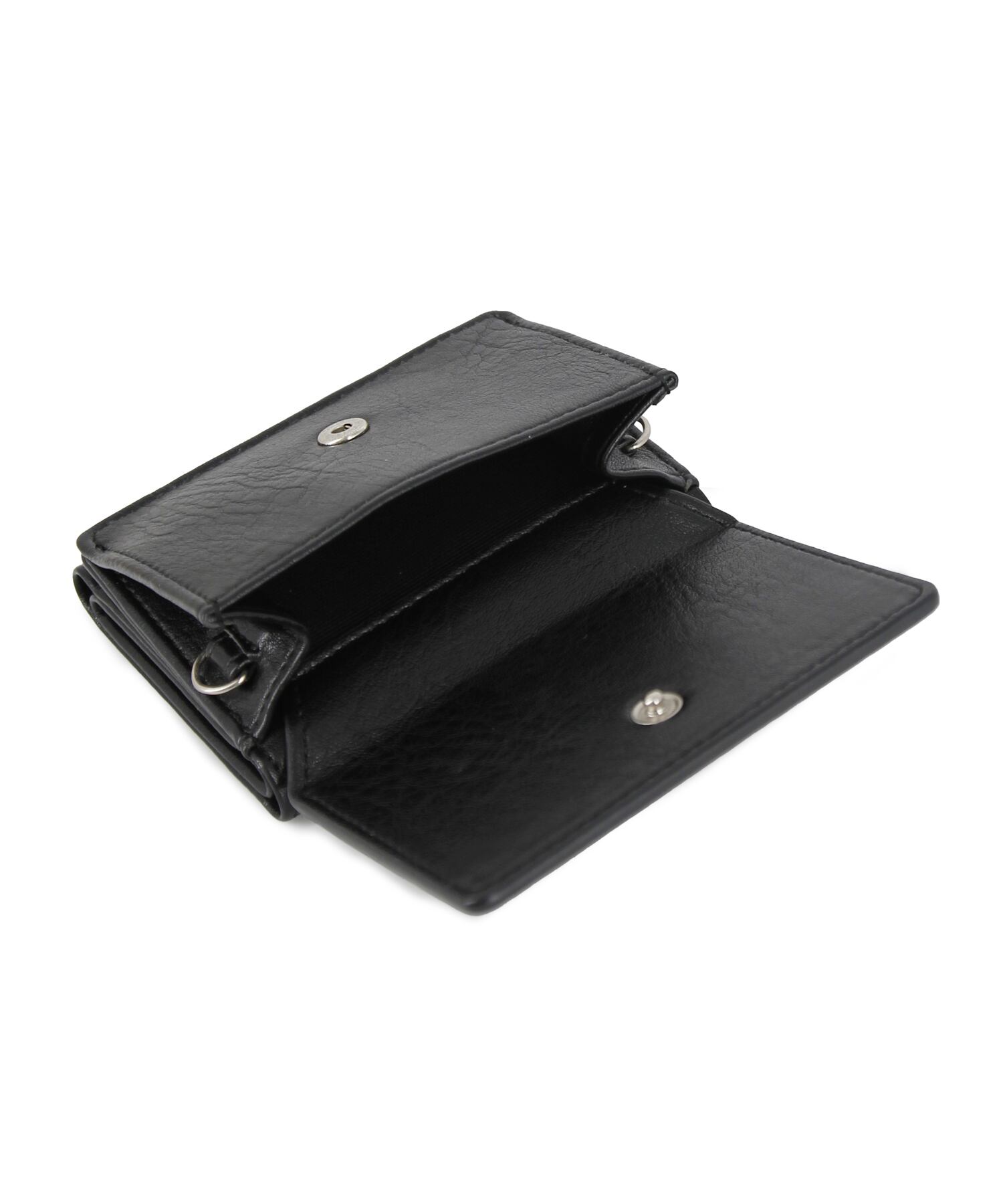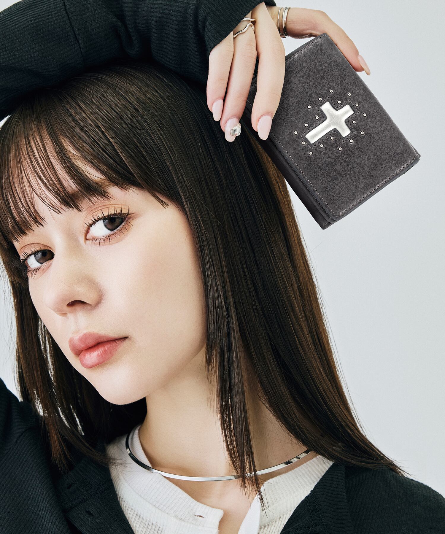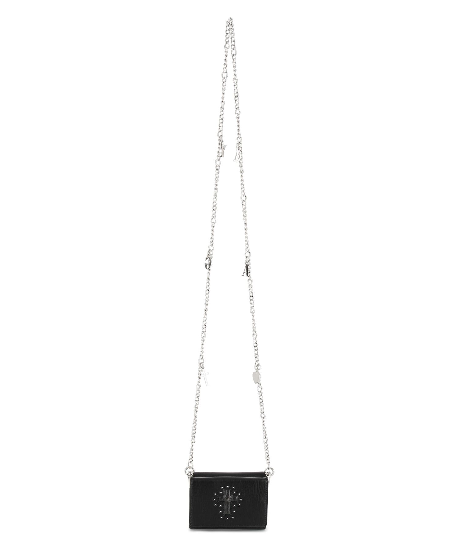 財布1つで出かけたい、そんな時にお使いいただけるチェーンショルダー付きマイクロミニ財布。前面にはぷっくら感が印象的なクロスを施しクロスの周りには小さなスタッズを添えました。クラッシュ感のある素材感をお楽しみいただける、そんなお財布です。