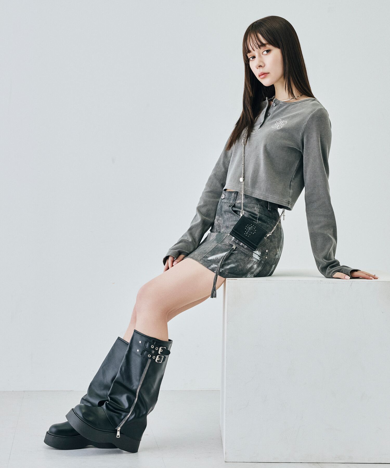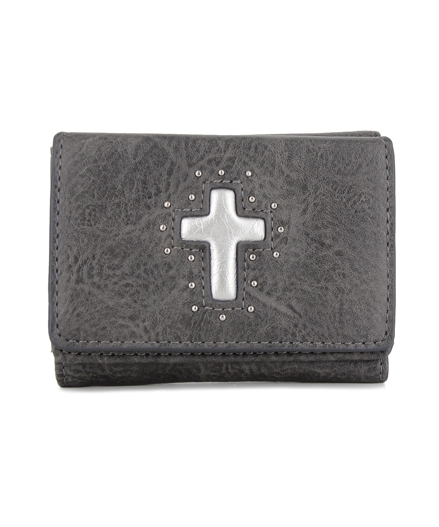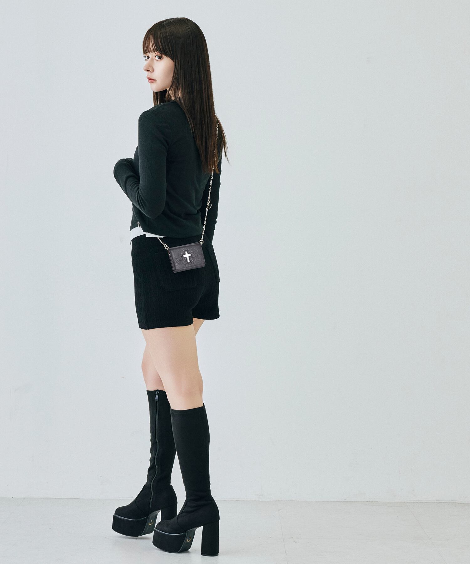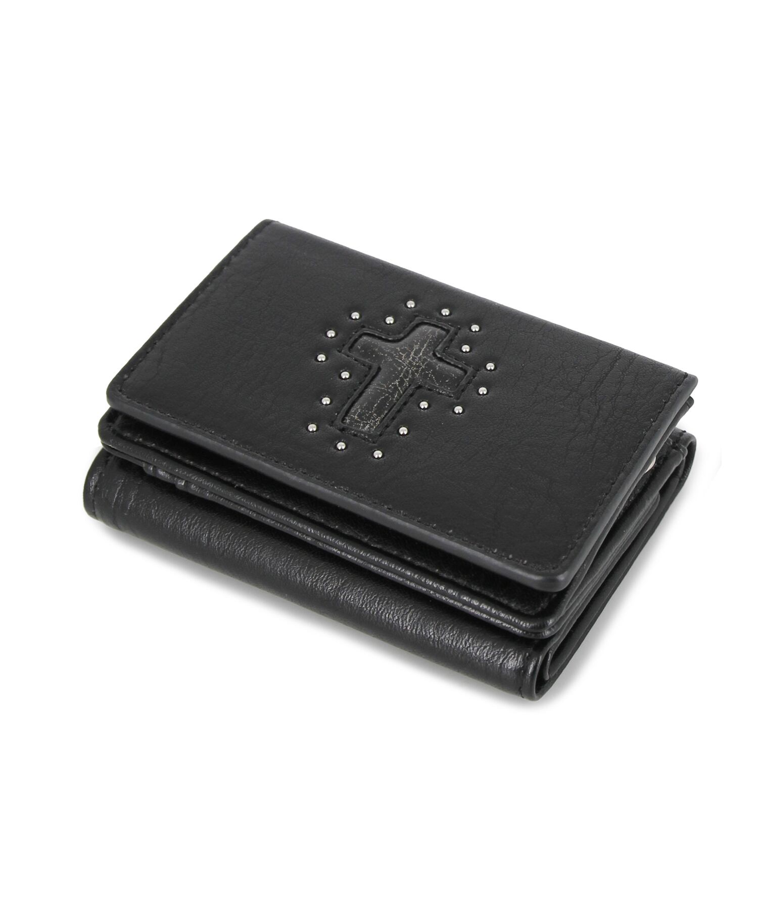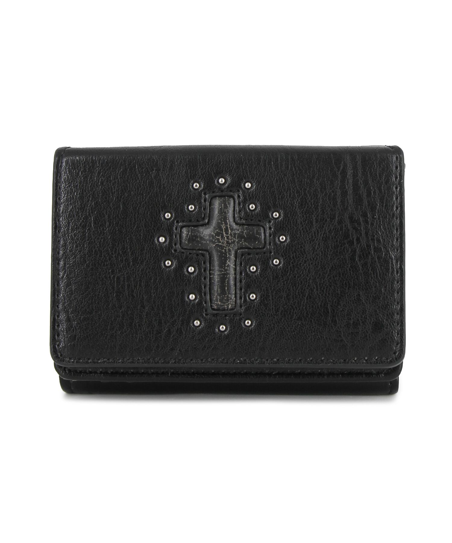 財布1つで出かけたい、そんな時にお使いいただけるチェーンショルダー付きマイクロミニ財布。前面にはぷっくら感が印象的なクロスを施しクロスの周りには小さなスタッズを添えました。クラッシュ感のある素材感をお楽しみいただける、そんなお財布です。