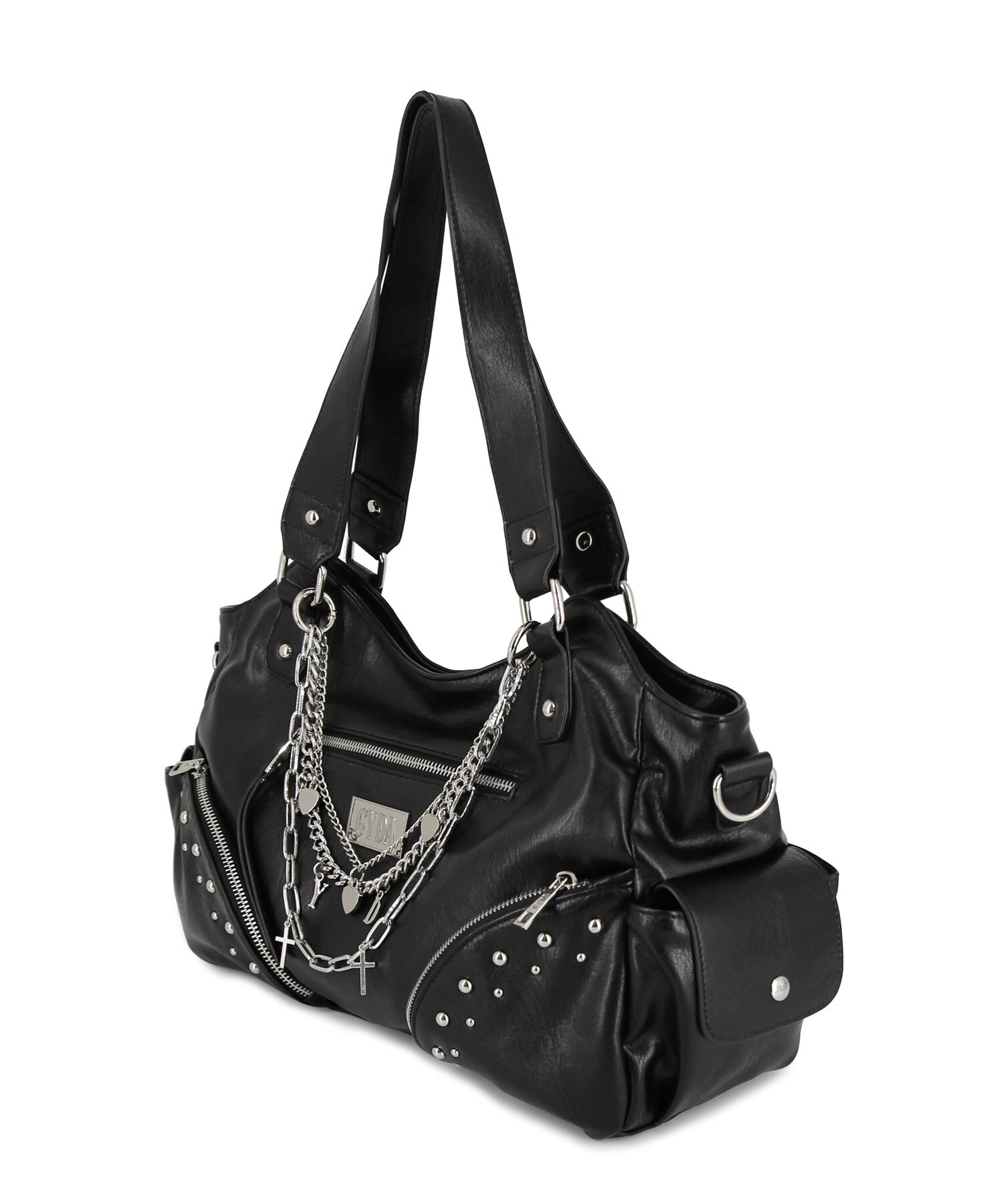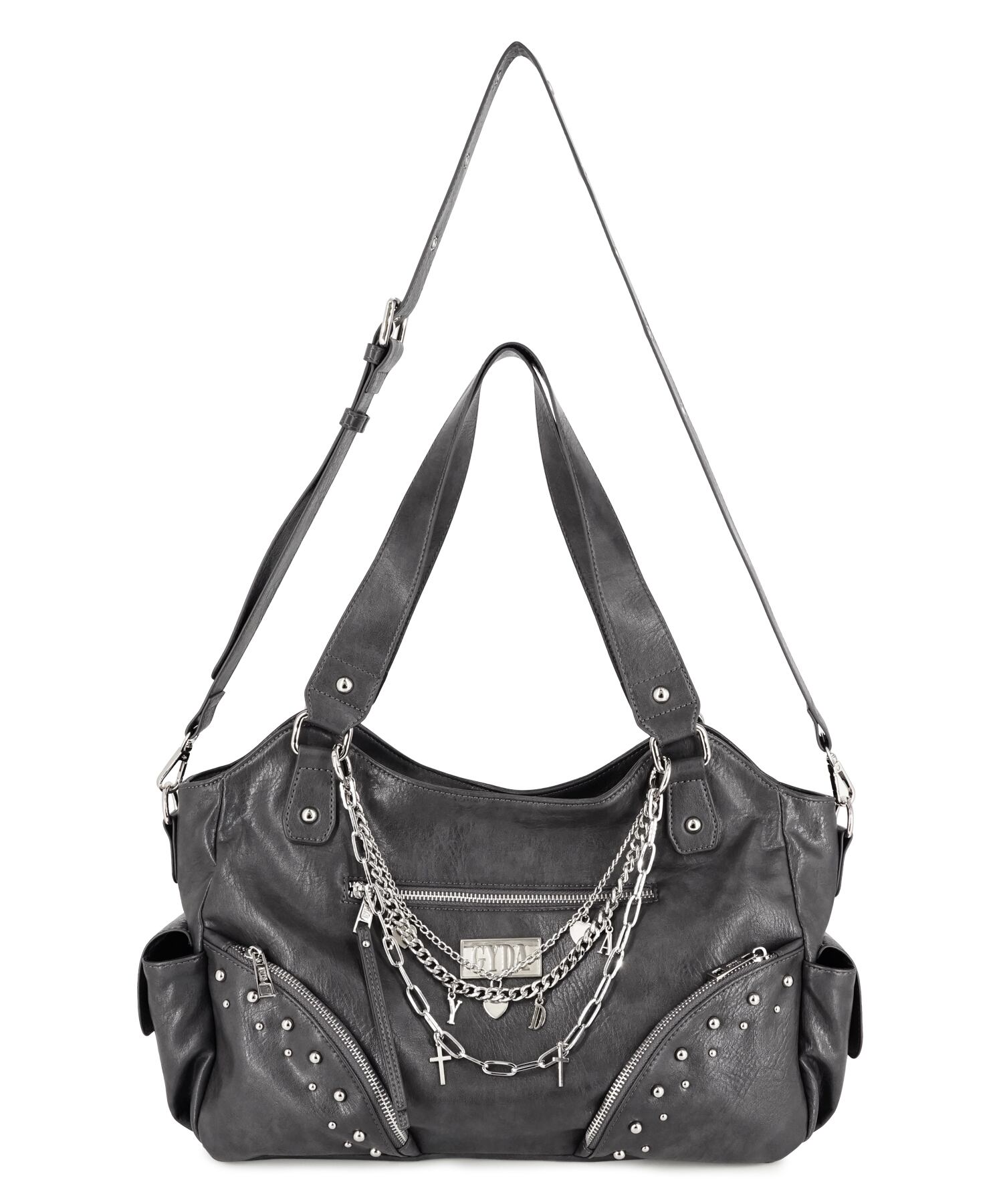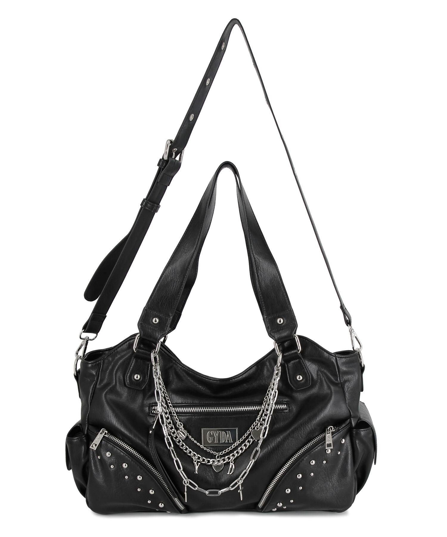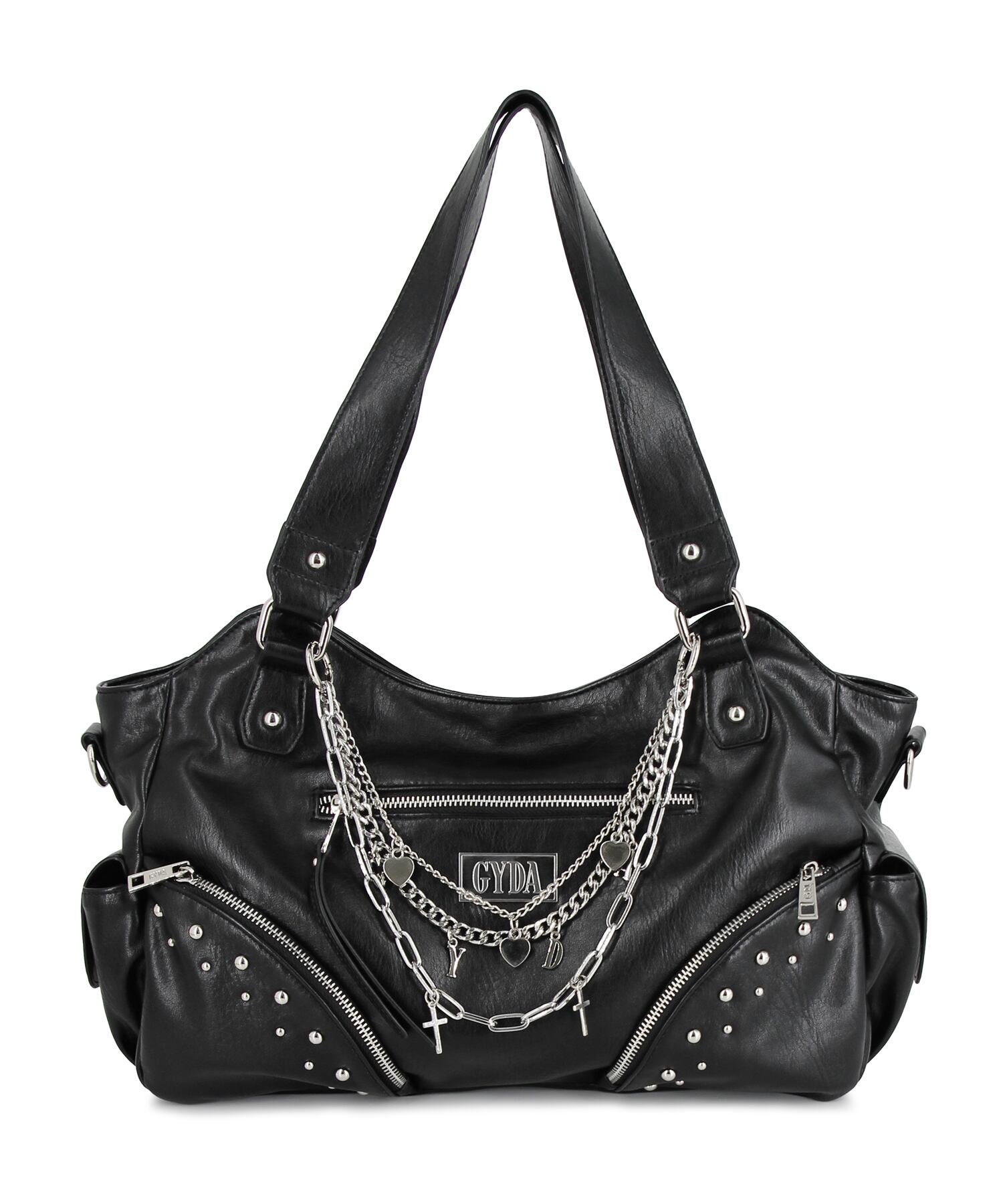 前面と背面で違った表情を持つリバーシブルタイプのトートバッグ。大きめサイズで仕上げる事で華奢な身体のラインを作り出してくれます。印象的な3連チェーンチャームにはGYDAの切り文字メタルやハートメタル、クロスメタルを添えて。取り外し可能で腰に付けても可愛いチャームです。