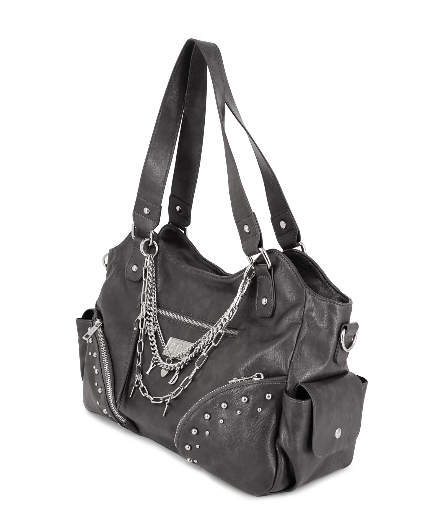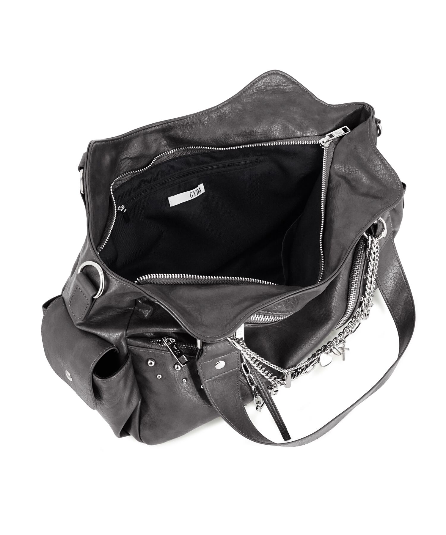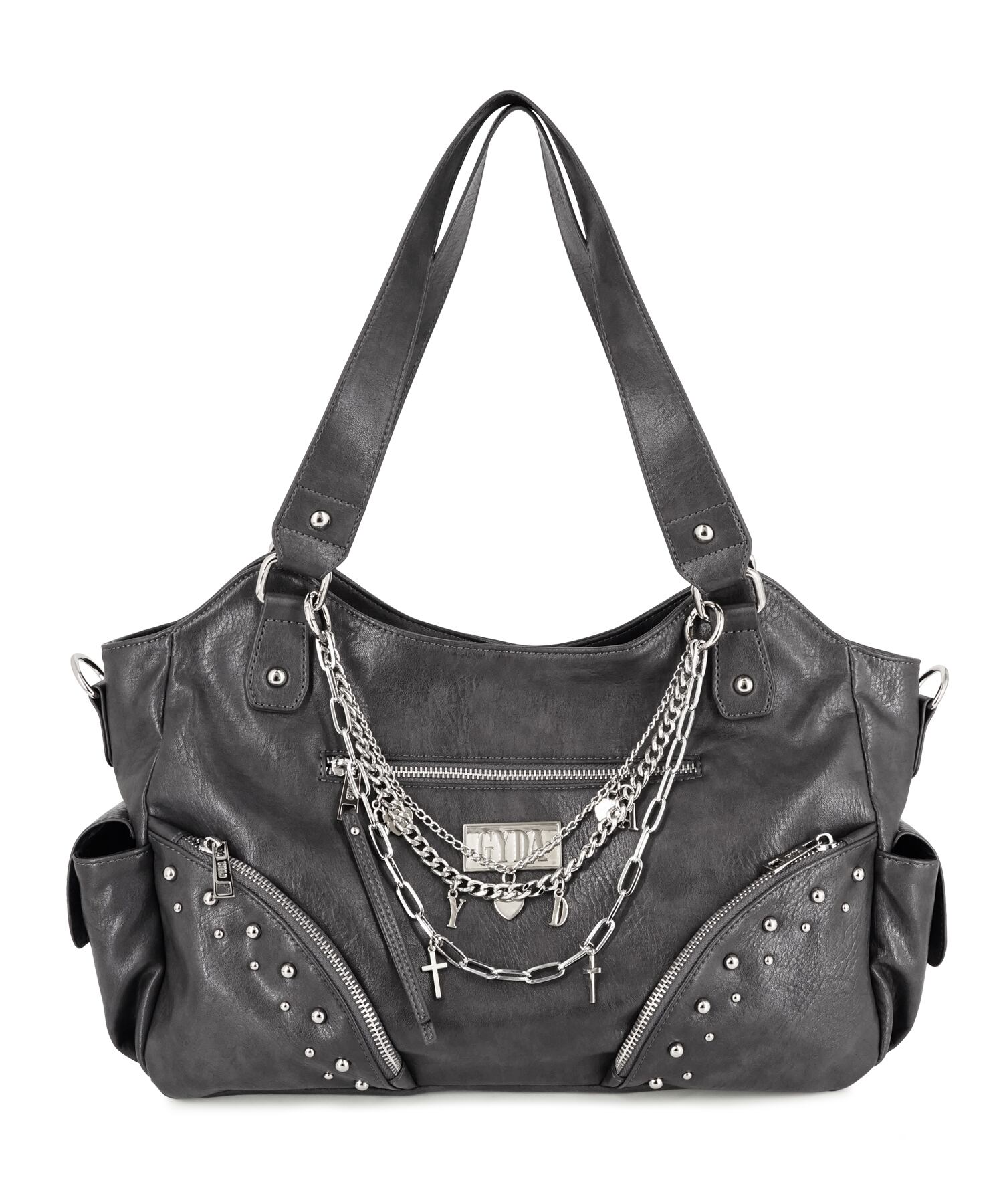 前面と背面で違った表情を持つリバーシブルタイプのトートバッグ。大きめサイズで仕上げる事で華奢な身体のラインを作り出してくれます。印象的な3連チェーンチャームにはGYDAの切り文字メタルやハートメタル、クロスメタルを添えて。取り外し可能で腰に付けても可愛いチャームです。