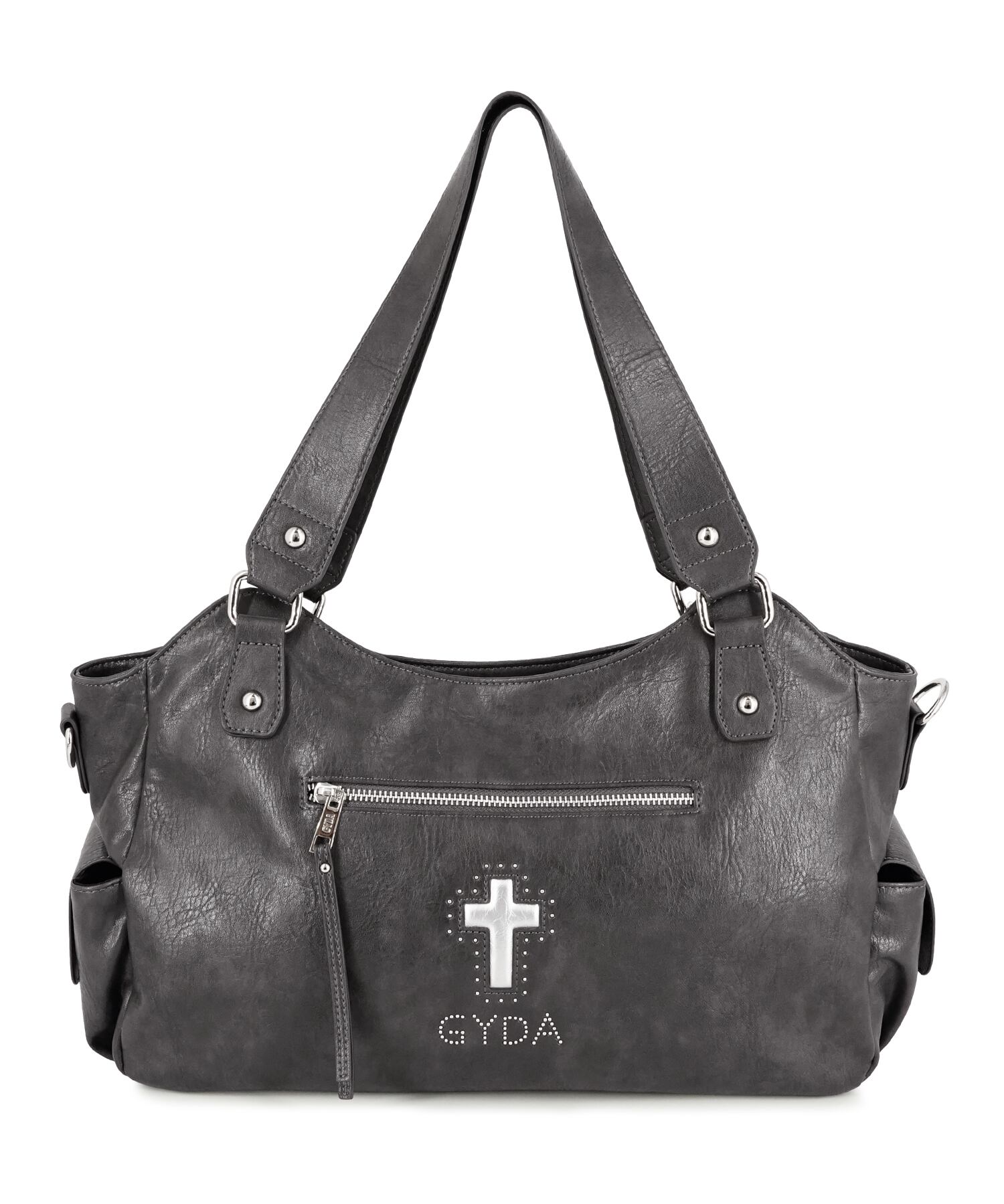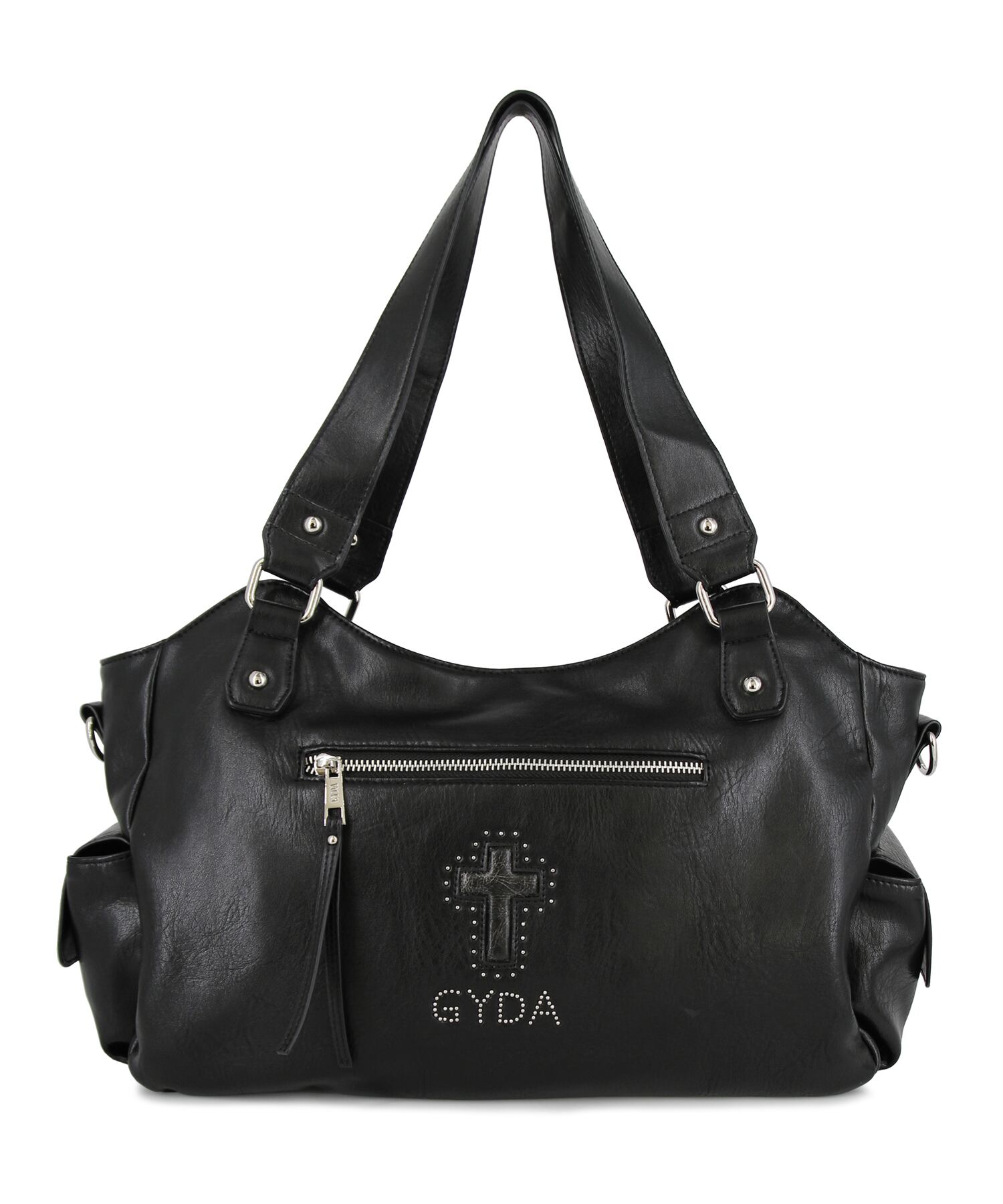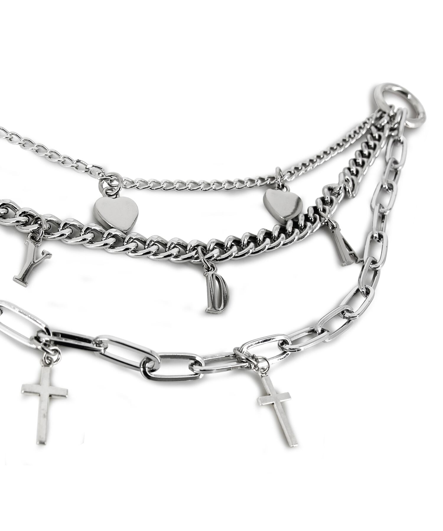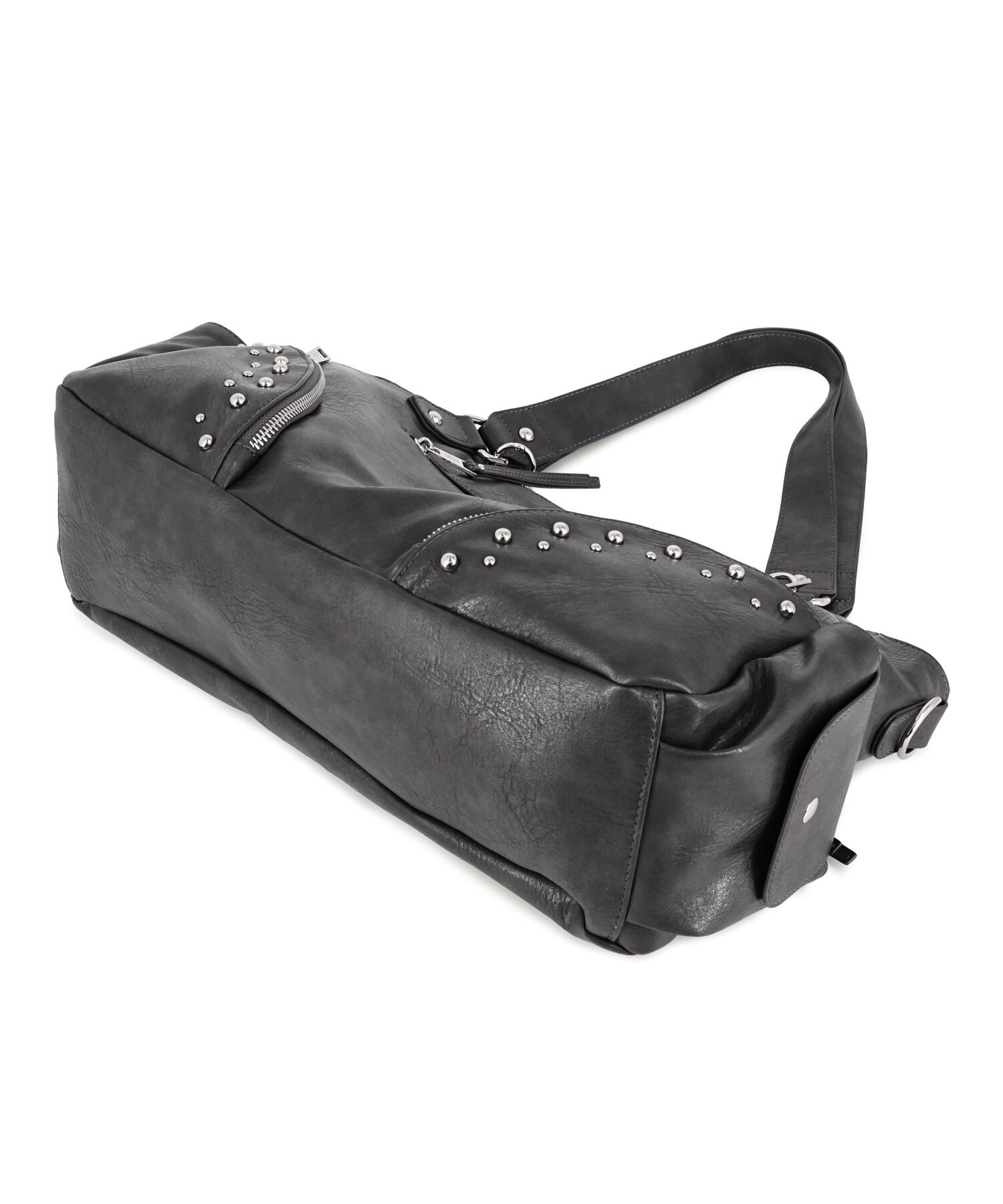 前面と背面で違った表情を持つリバーシブルタイプのトートバッグ。大きめサイズで仕上げる事で華奢な身体のラインを作り出してくれます。印象的な3連チェーンチャームにはGYDAの切り文字メタルやハートメタル、クロスメタルを添えて。取り外し可能で腰に付けても可愛いチャームです。