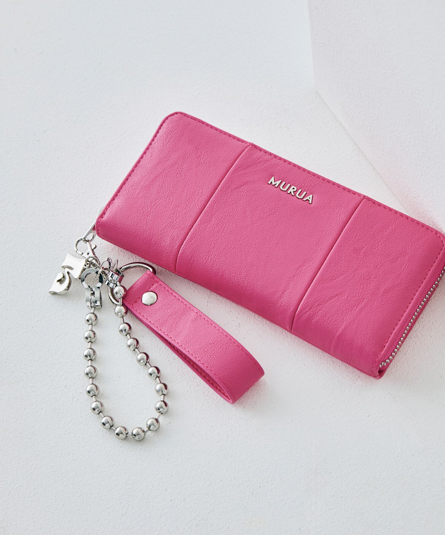 ボールチェーンを重ね合わせる事でトレンドのバッグチャームの雰囲気も持たせています。